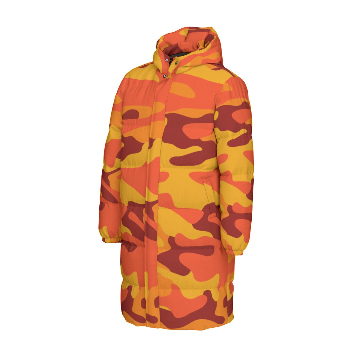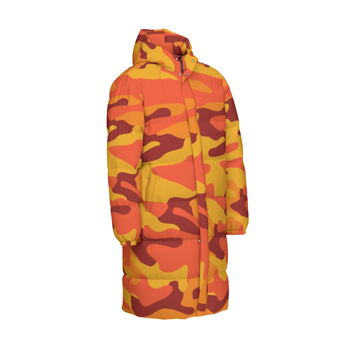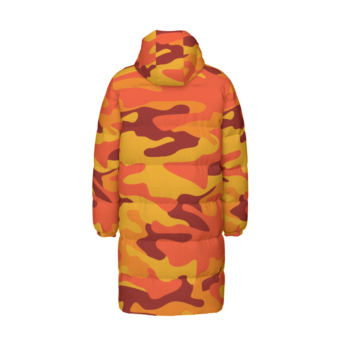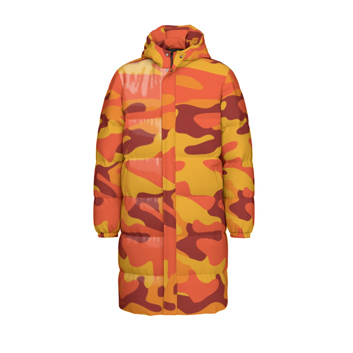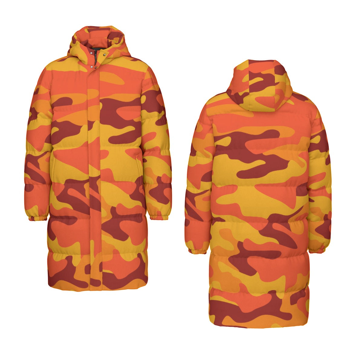 Stay warm and stylish with our Long Puffer Coat, perfect for both men and women. With its vibrant orange and red camouflage print, you'll stand out in the crowd. Stay cozy and chic this winter season.