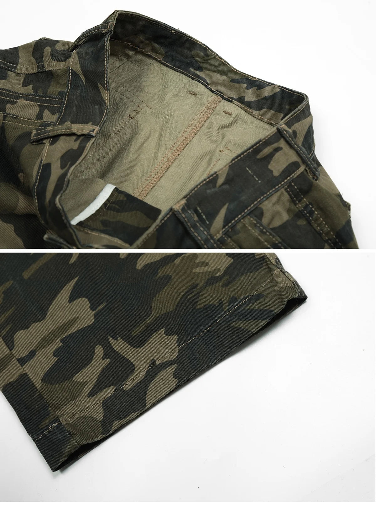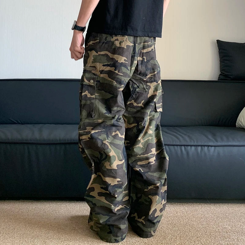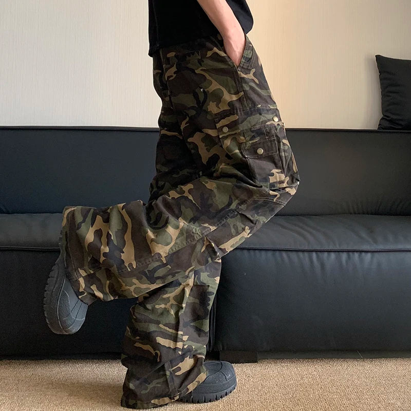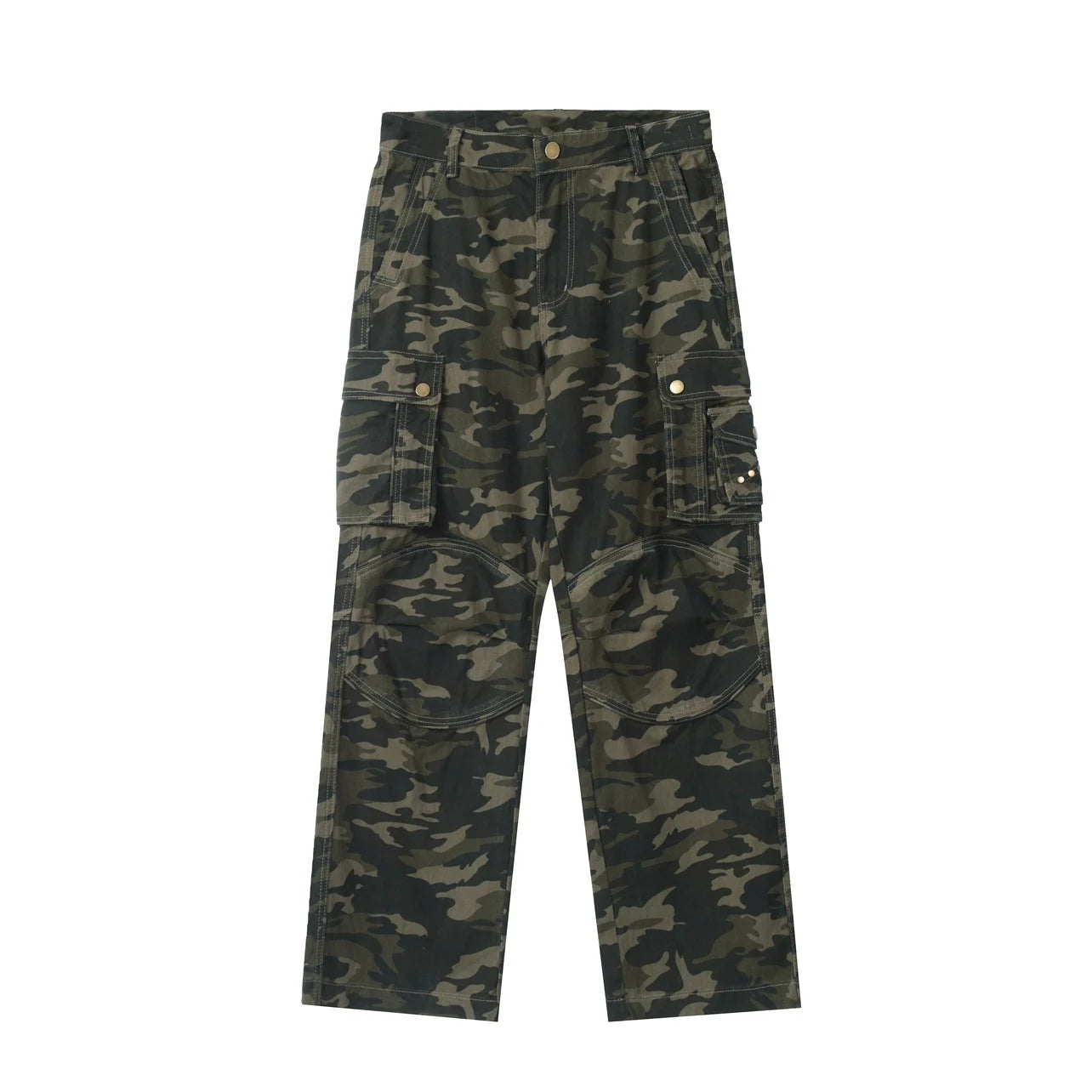 Loose Straight Camo Workwear Pants High Waist with Large Pockets