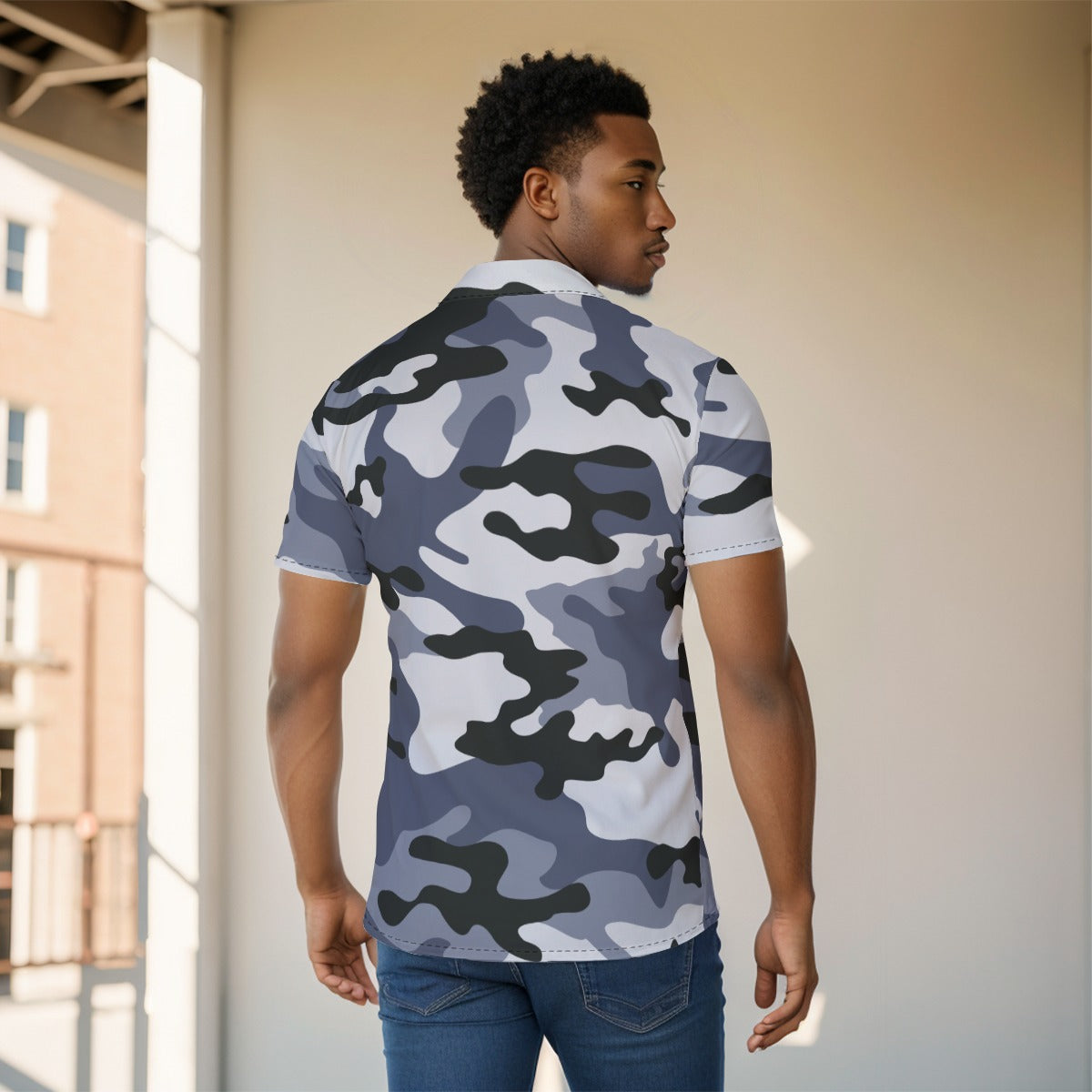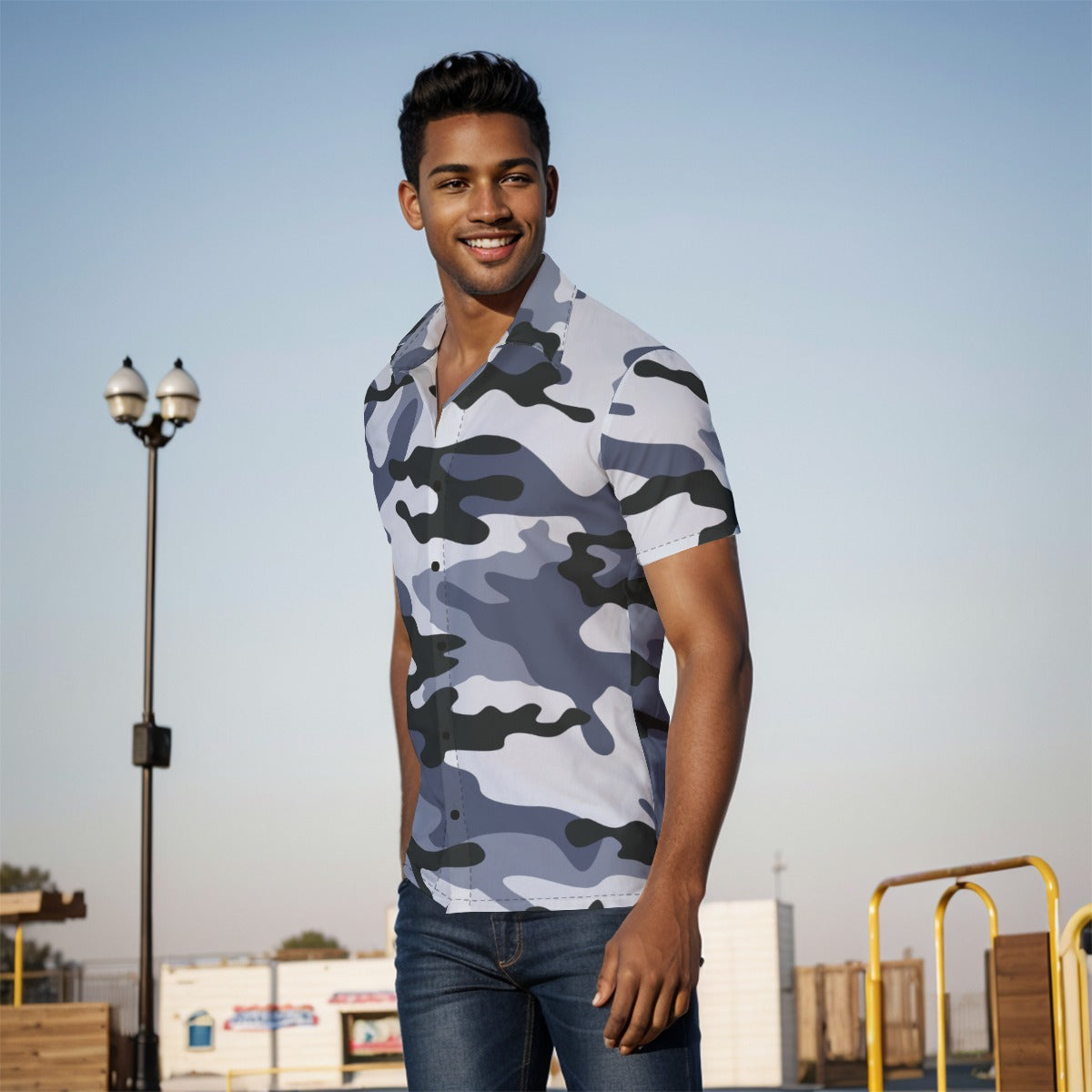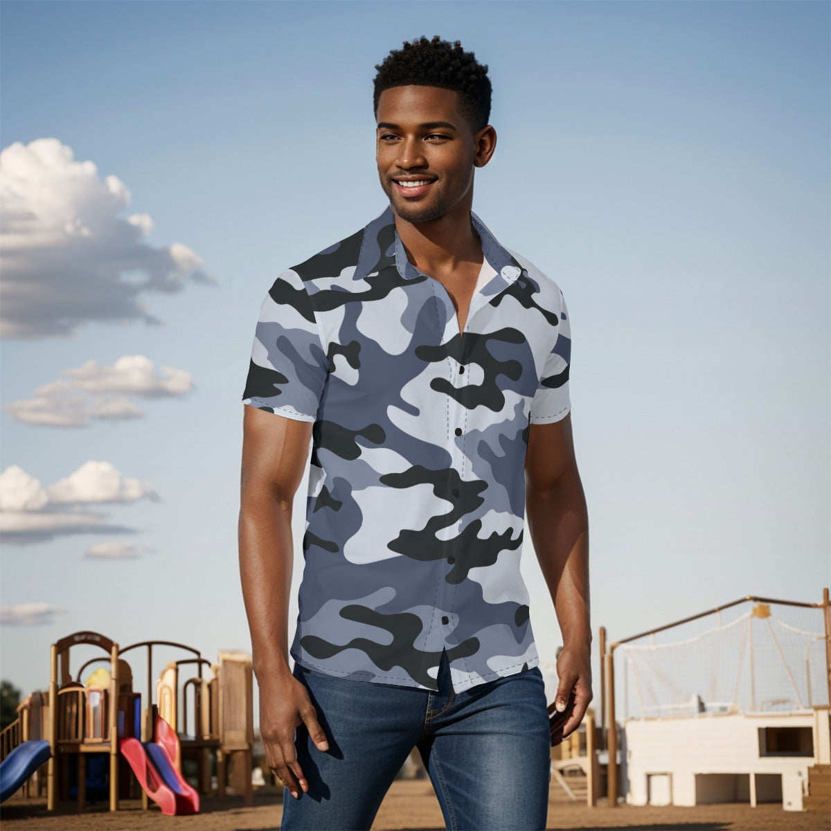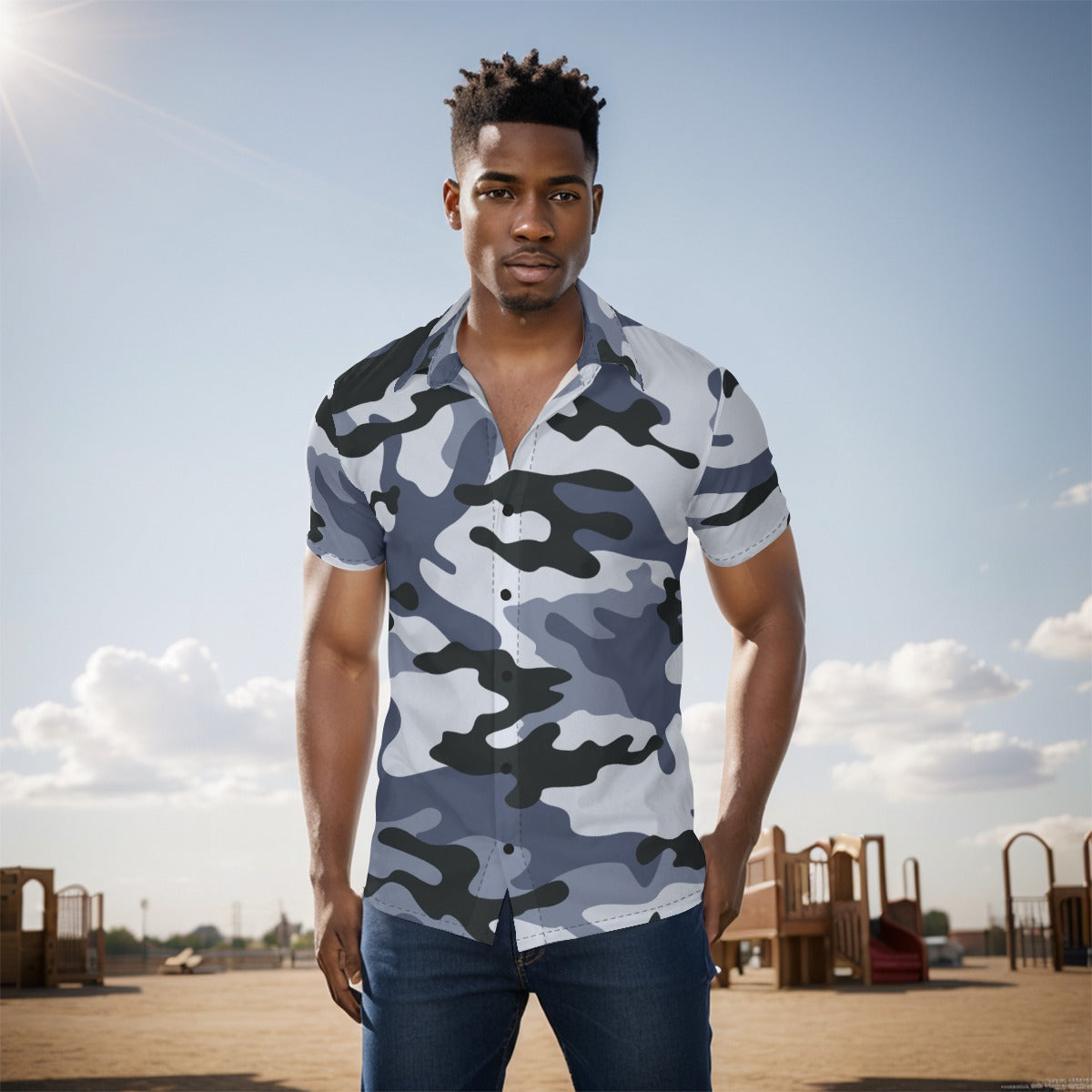 Expertly crafted, this men's button-up shirt showcases a trendy light blue camo print. Designed with high-quality materials, it offers a stylish and comfortable fit. Perfect for any occasion, this shirt adds a touch of sophistication to any outfit.