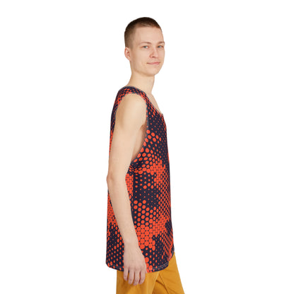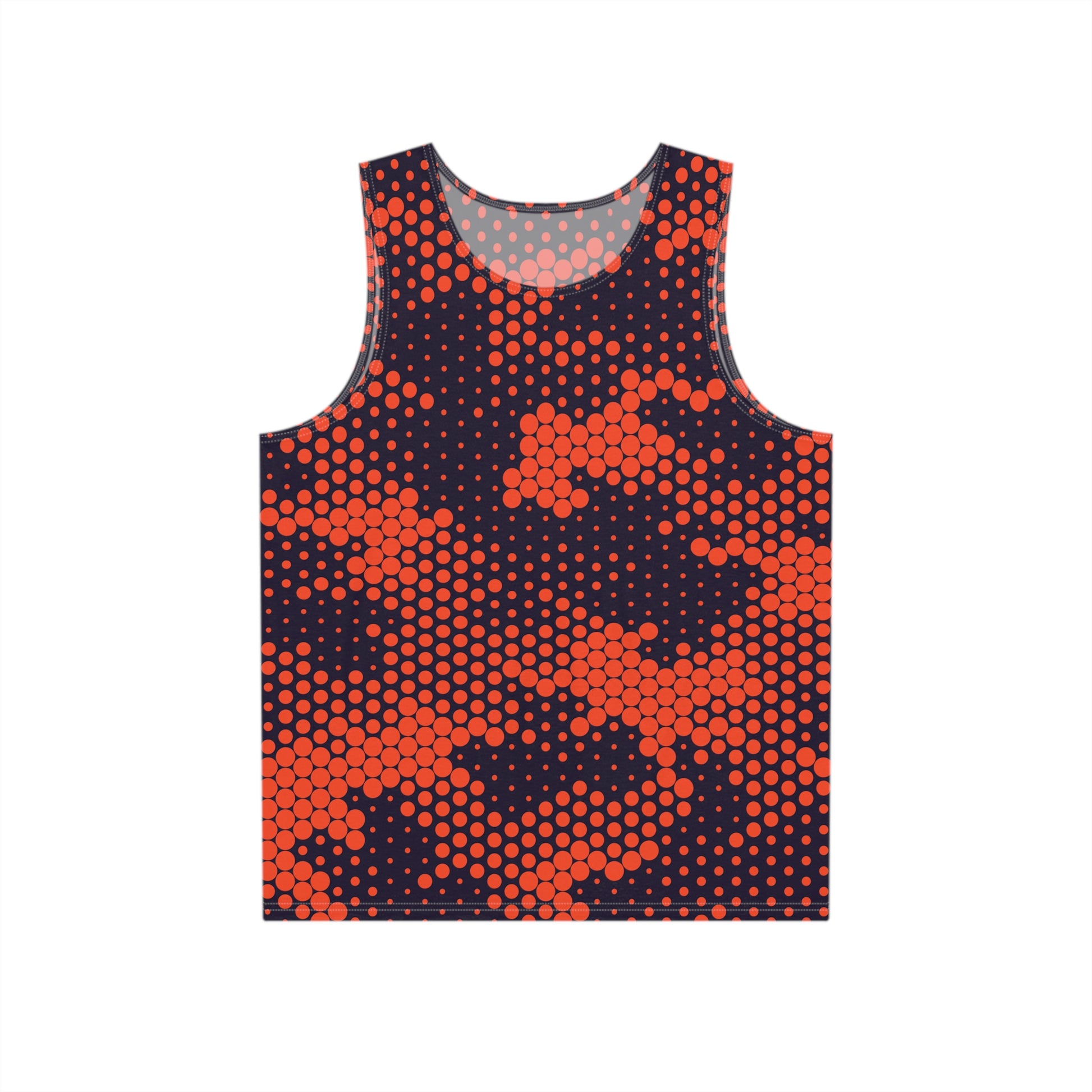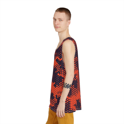 This Men's Camo Tank Top features a unique Orange & Blue Digital print and a loose fit for ultimate comfort and style. With a camouflage design and bright colors, this tank top is perfect for standing out while still blending in. Stay cool and stylish with this camo tank top.
