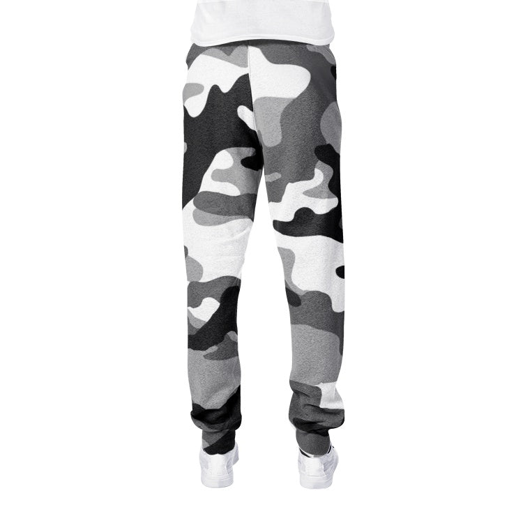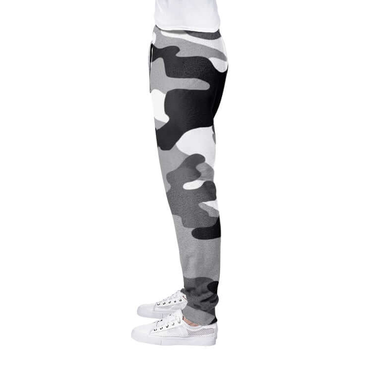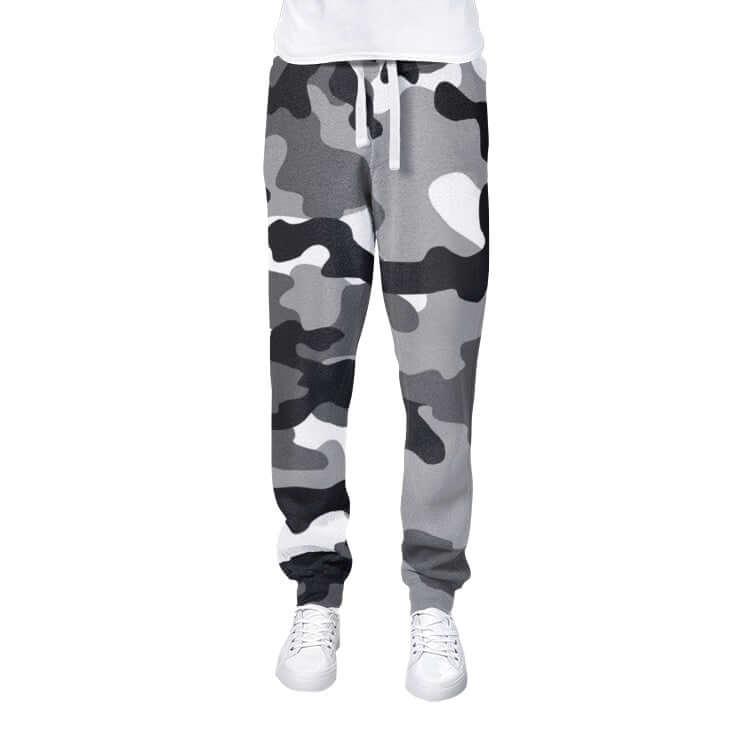 These men's camo track pants in black, white, and gray are designed for both comfort and style. Made with durable fabric, they offer a blend of utility and fashion. Perfect for any outdoor activity, these pants provide versatility and a sleek camo design that will elevate any outfit.