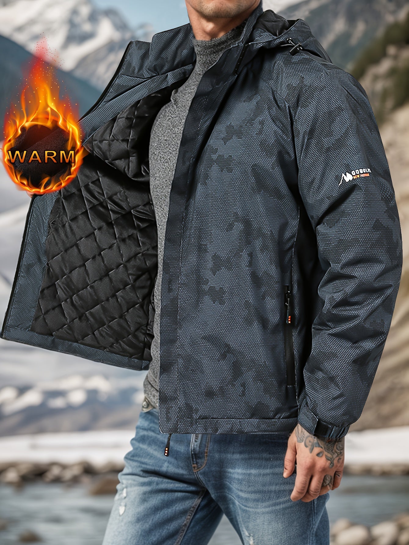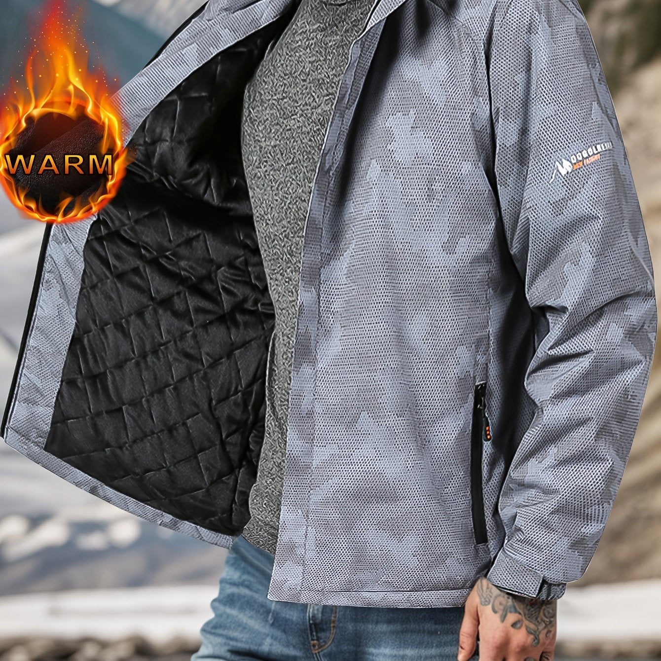 Men's Camo Windproof Jacket: Detachable Hood, Fleece-Lined, Zip Closure