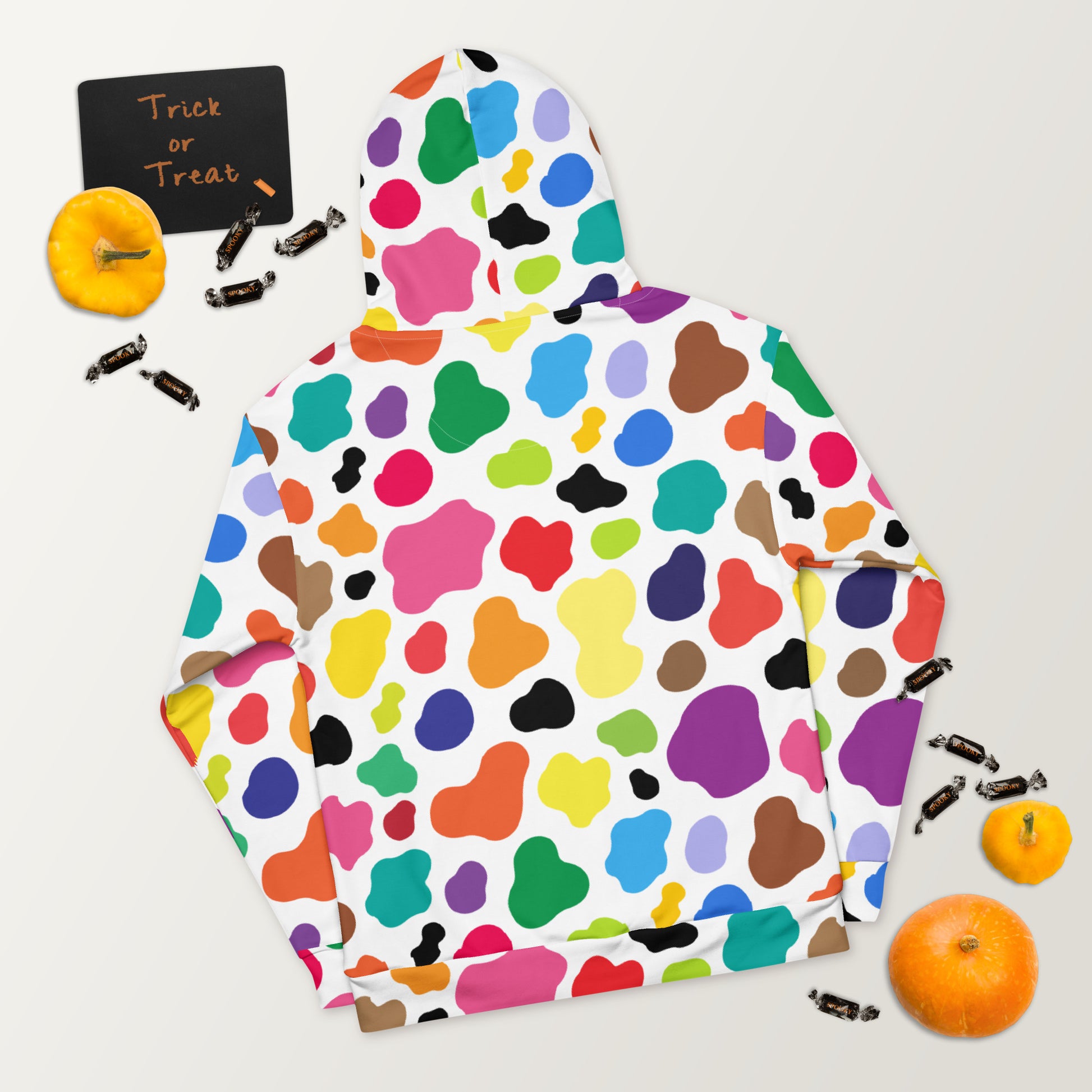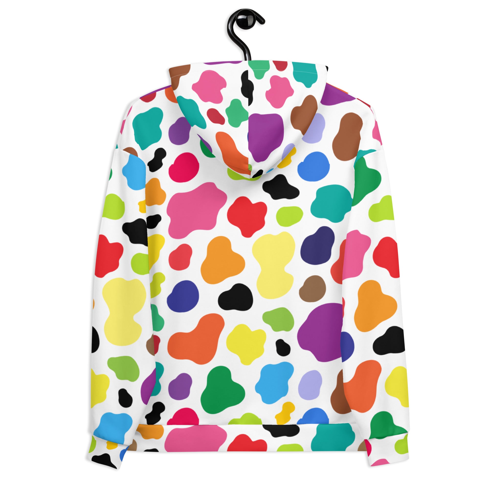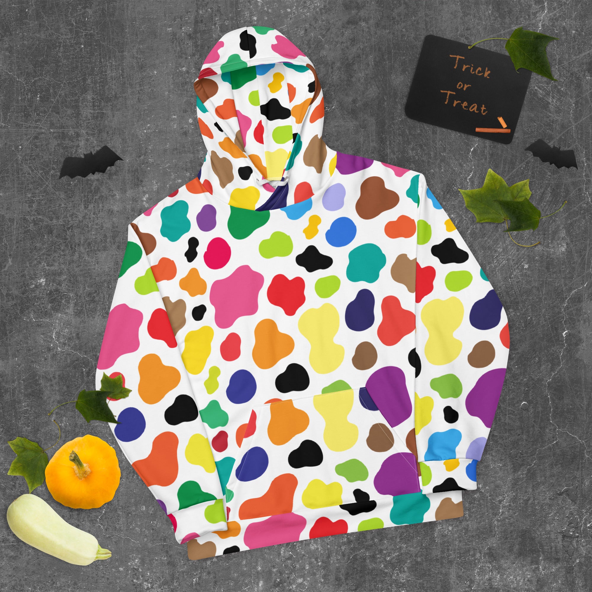Make a bold statement with this Multicolor Cow Print Hoodie, designed to suit all genders. Featuring a vibrant and playful cow print pattern in an array of striking colors, this hoodie is perfect for those who love to stand out. Crafted from a premium fabric blend, it offers a soft touch and durable wear. The relaxed fit ensures all-day comfort, while the adjustable drawstring hood and front kangaroo pocket provide practicality and style. Whether you're heading out or chilling at home, this hoodie effortlessly blends uniqueness with versatility. Pair it with jeans, joggers, or shorts to create a look that's truly your own.