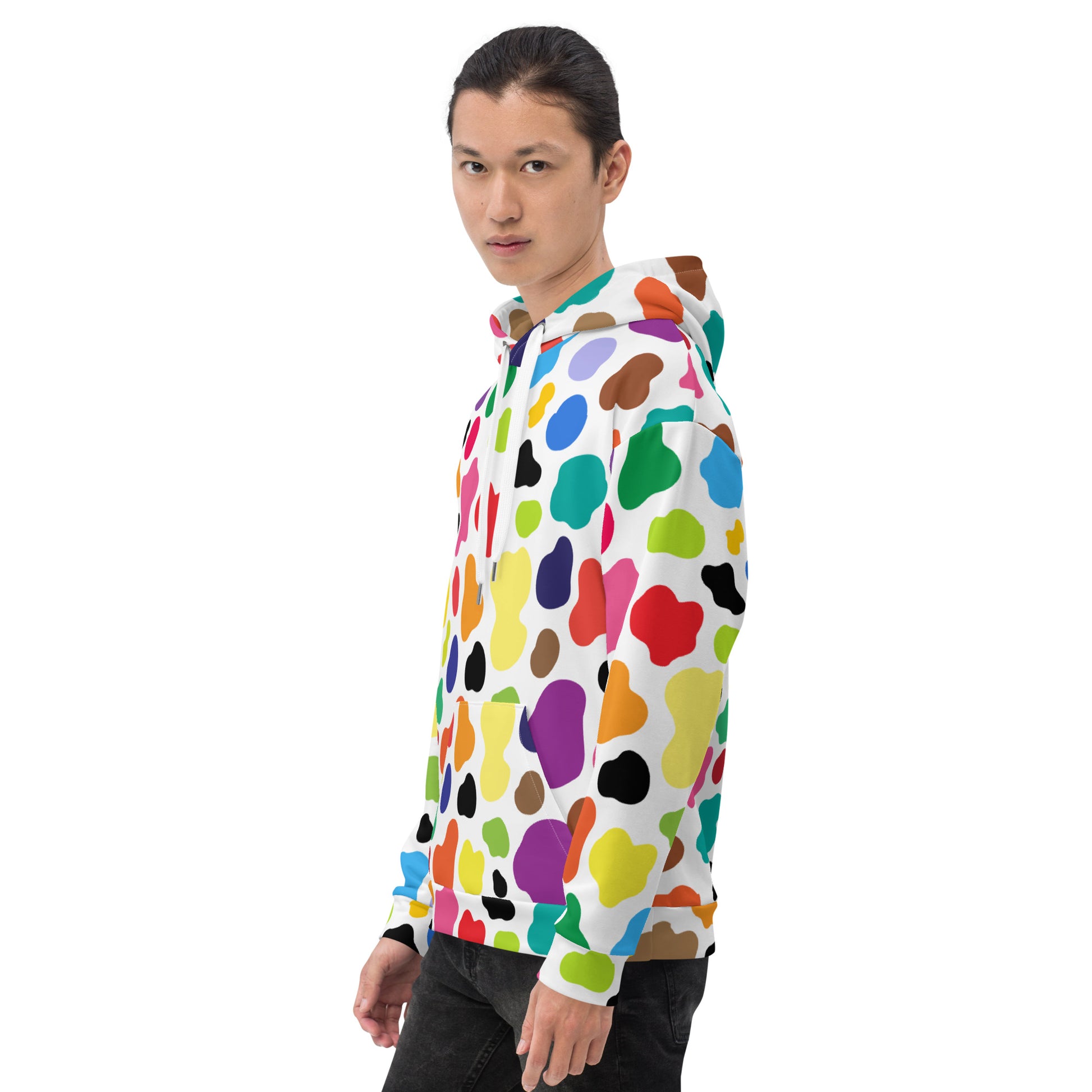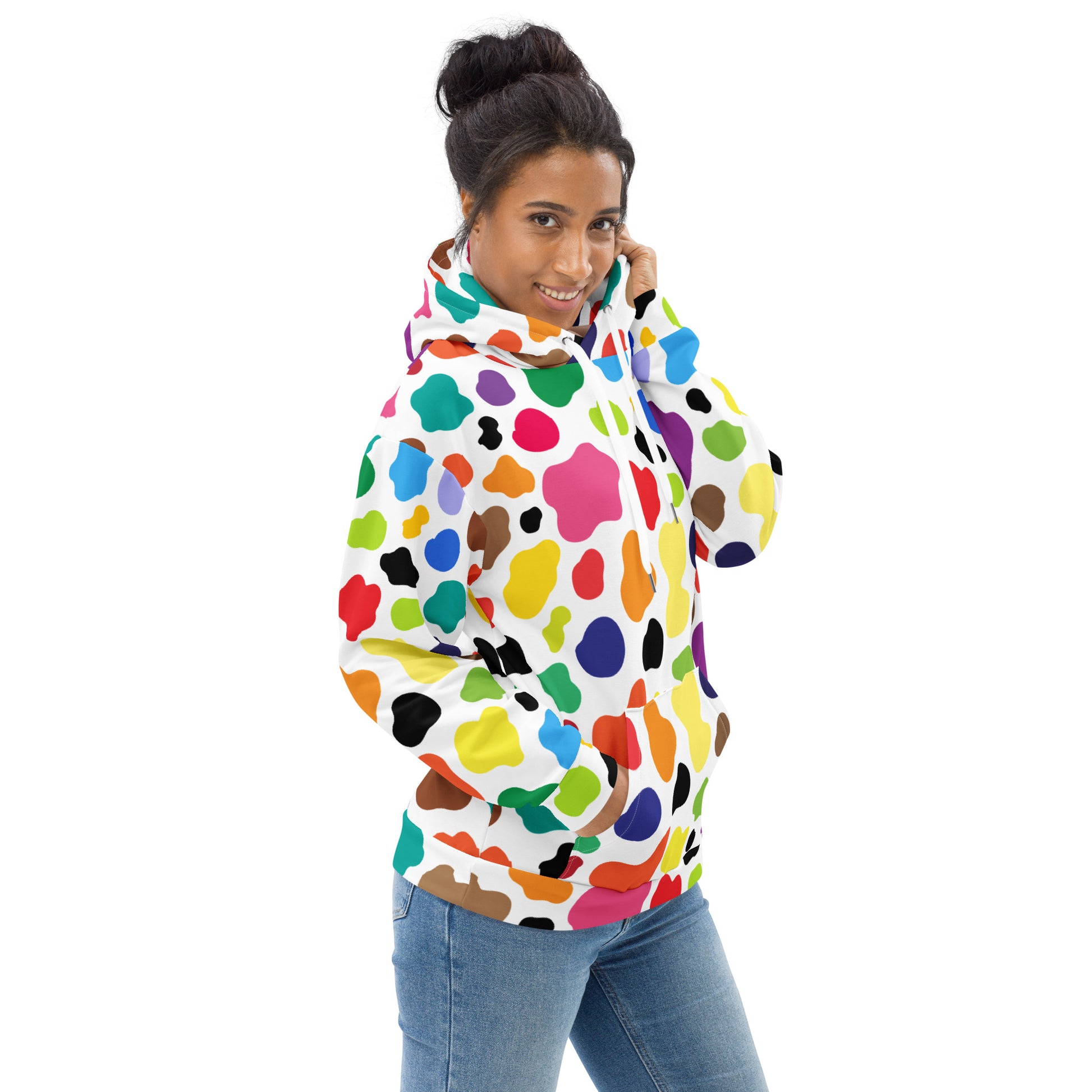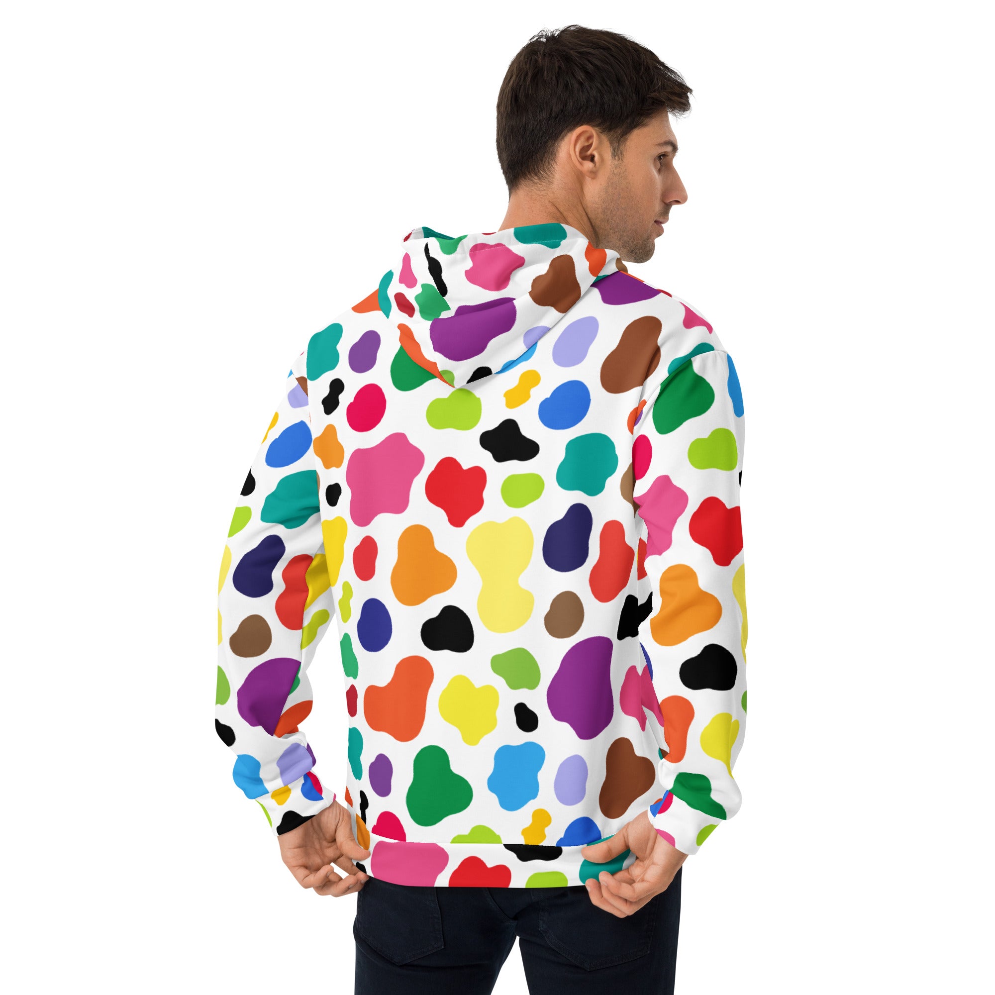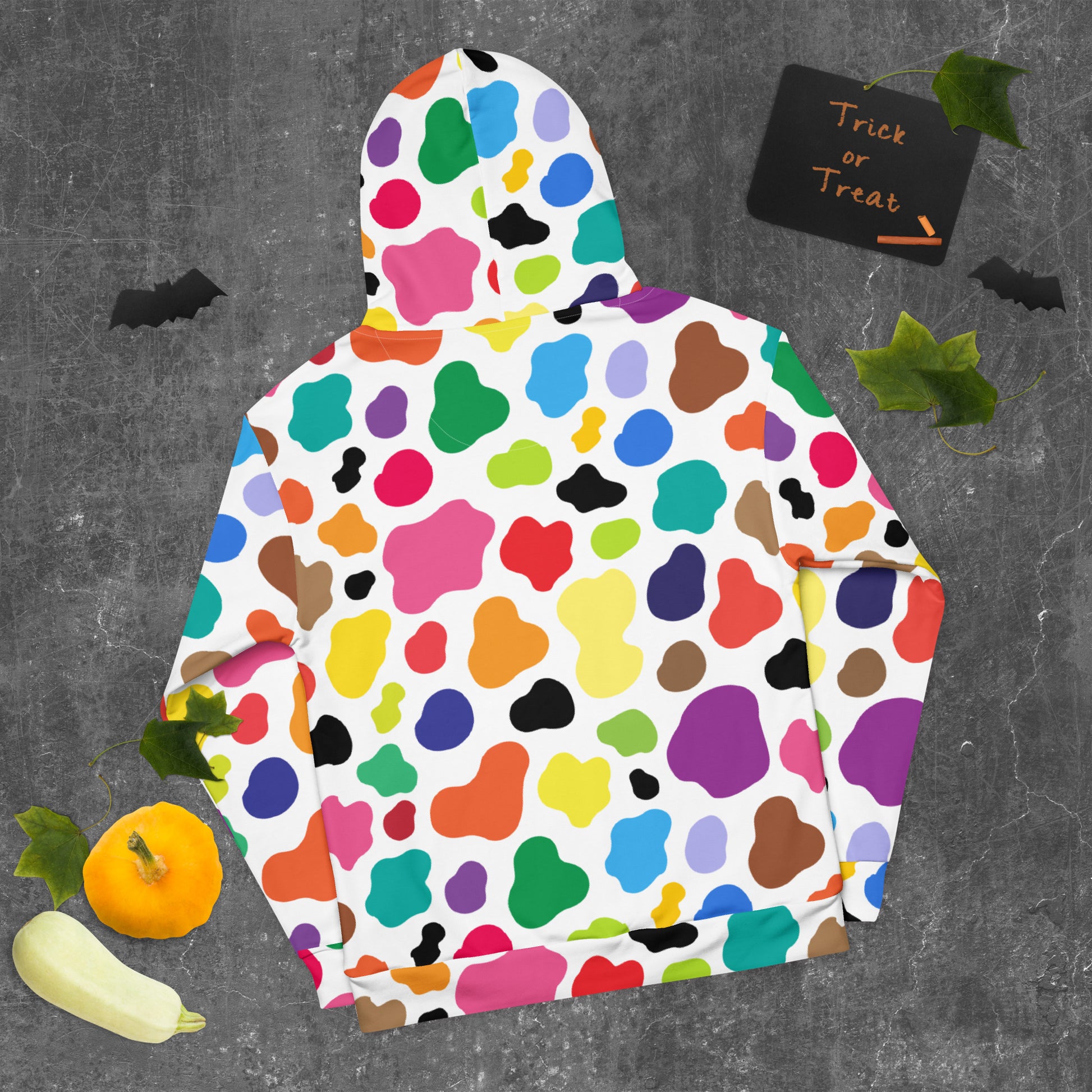 Make a bold statement with this Multicolor Cow Print Hoodie, designed to suit all genders. Featuring a vibrant and playful cow print pattern in an array of striking colors, this hoodie is perfect for those who love to stand out. Crafted from a premium fabric blend, it offers a soft touch and durable wear. The relaxed fit ensures all-day comfort, while the adjustable drawstring hood and front kangaroo pocket provide practicality and style. Whether you're heading out or chilling at home, this hoodie effortlessly blends uniqueness with versatility. Pair it with jeans, joggers, or shorts to create a look that's truly your own.