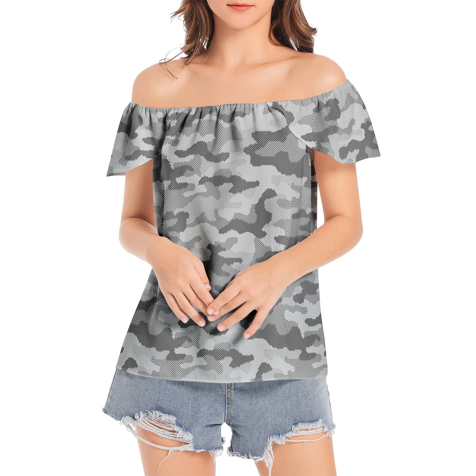 This off-the-shoulder camo top features a digital gray camouflage design. The unique design is perfect for those who want to make a statement and stand out from the crowd. Made from high-quality fabric, it offers comfort and style to any outfit.