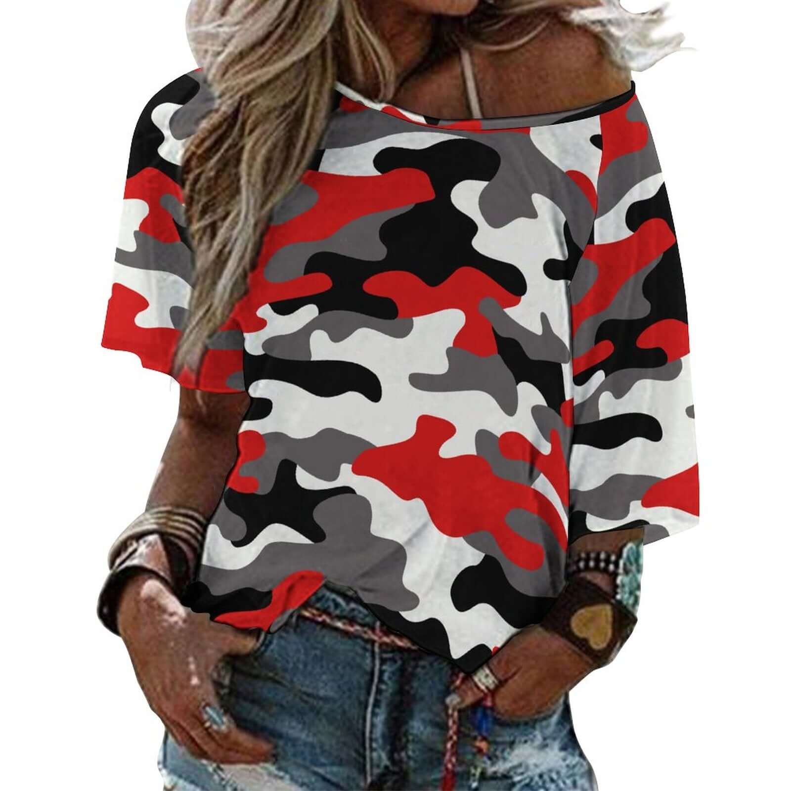 Discover the versatile style of our Off The Shoulder Top in Red, Black, and White Camo. With its unique design, you can dress it up or down for any occasion. Made with high-quality materials, this top offers both comfort and fashion. Elevate your wardrobe with this must-have shirt.