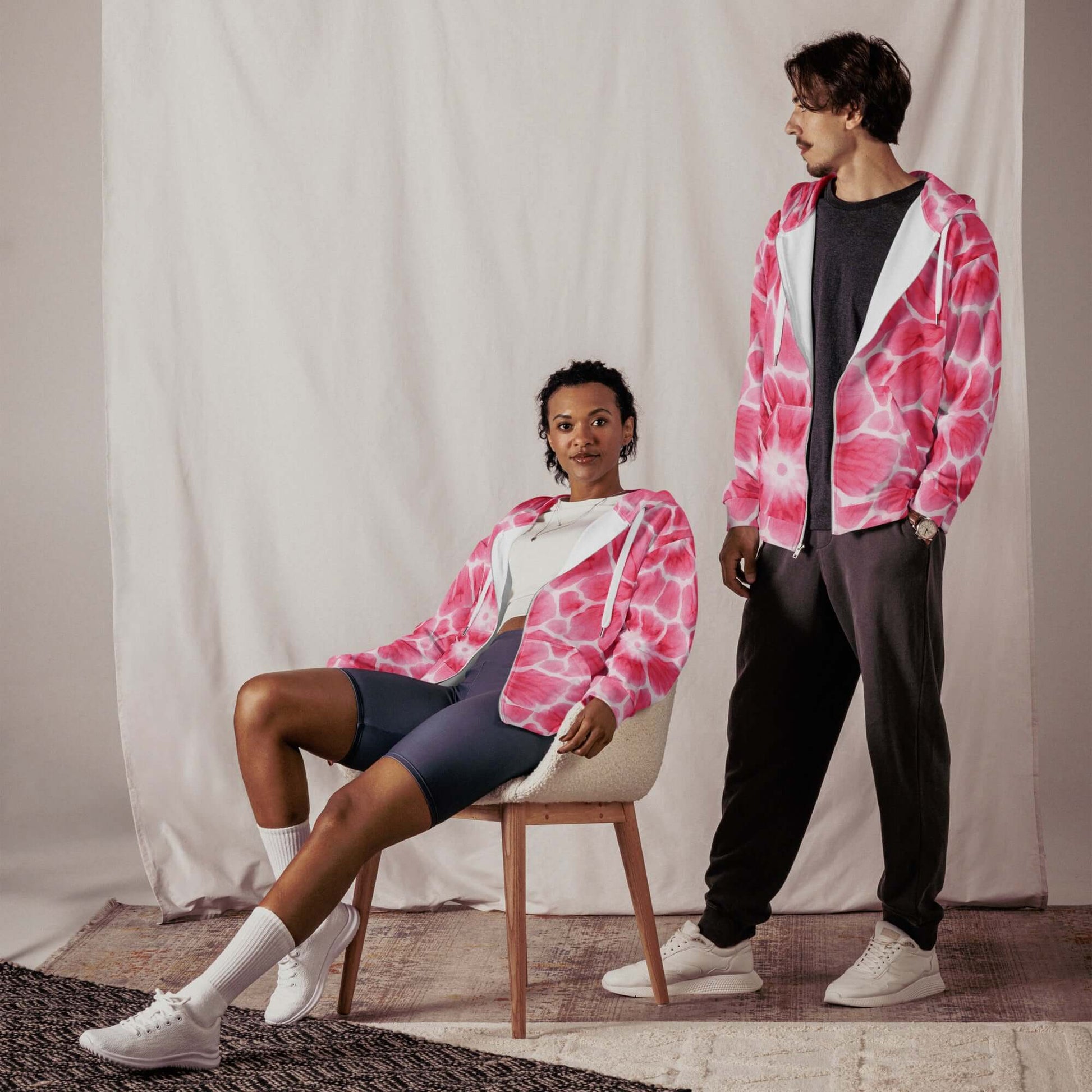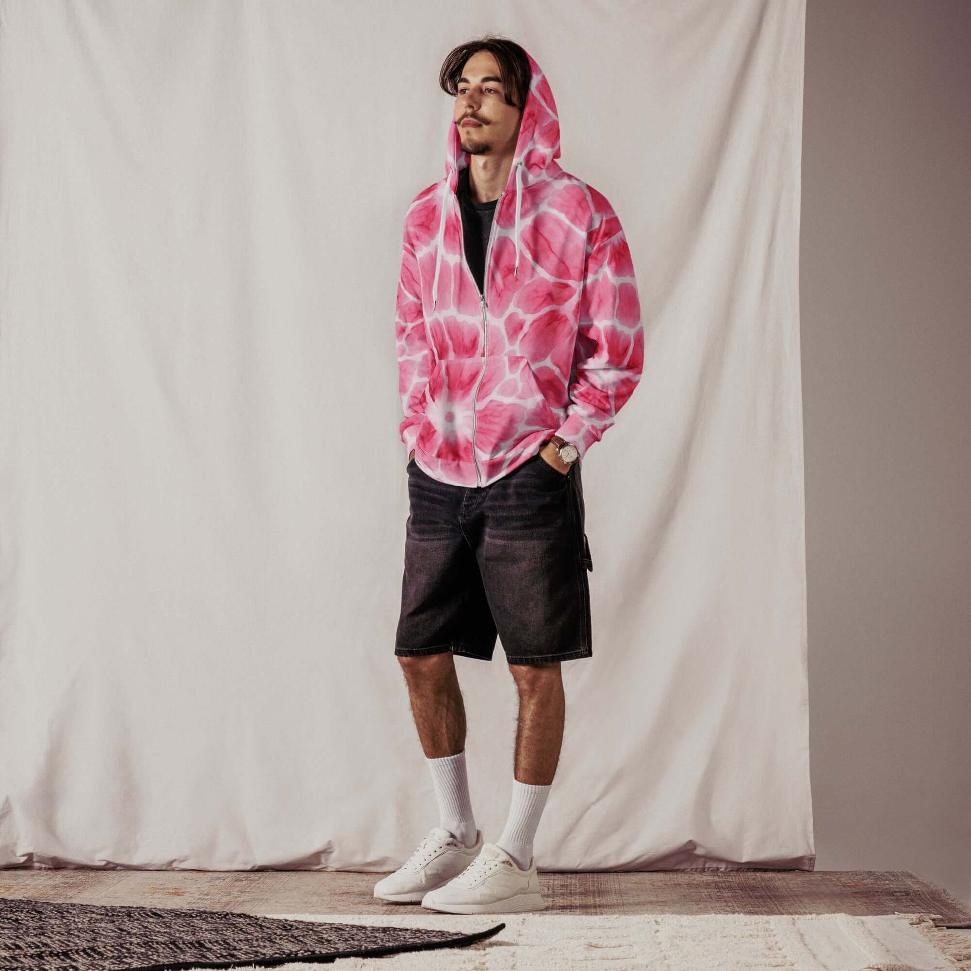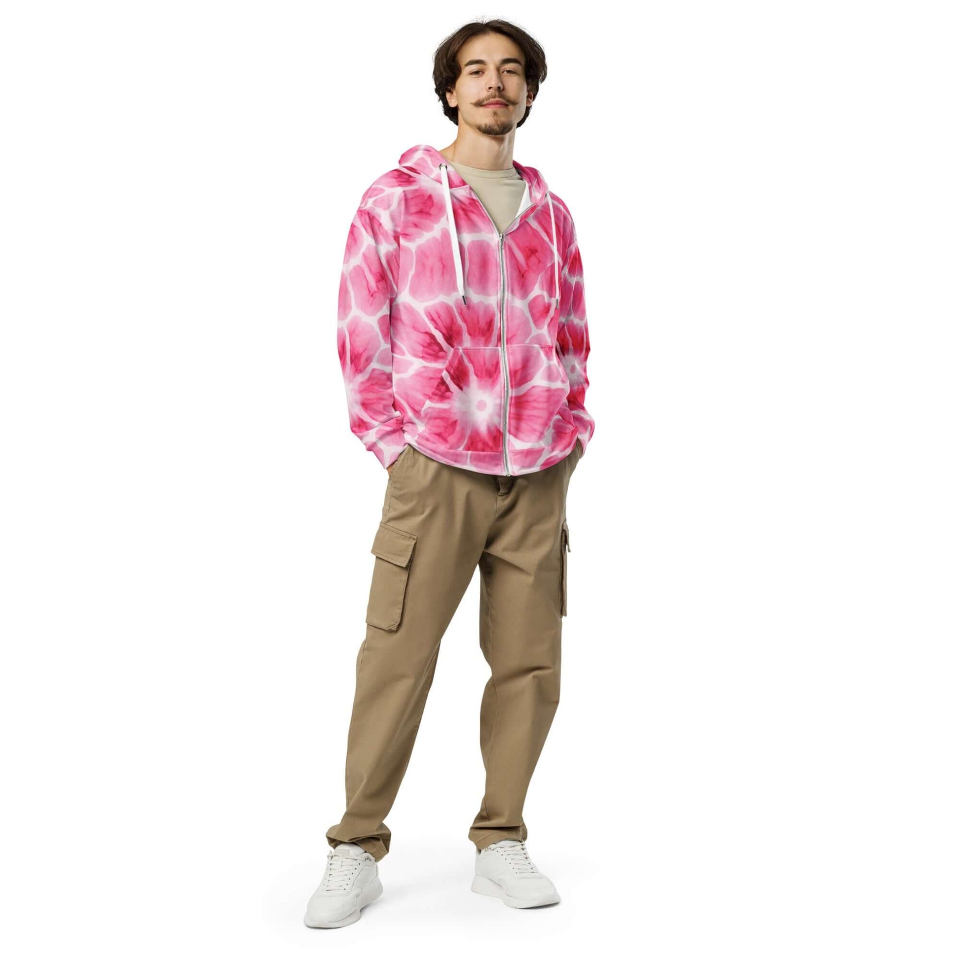 Stay cozy and stylish with our Pink & White Tie-Dye Zip Hoodie. Made of soft and swirl-patterned fabric, this hoodie exudes chill vibes. Perfect for any casual occasion, it's a must-have for any wardrobe. Add a pop of color with its pink and white tie-dye design. Available now.