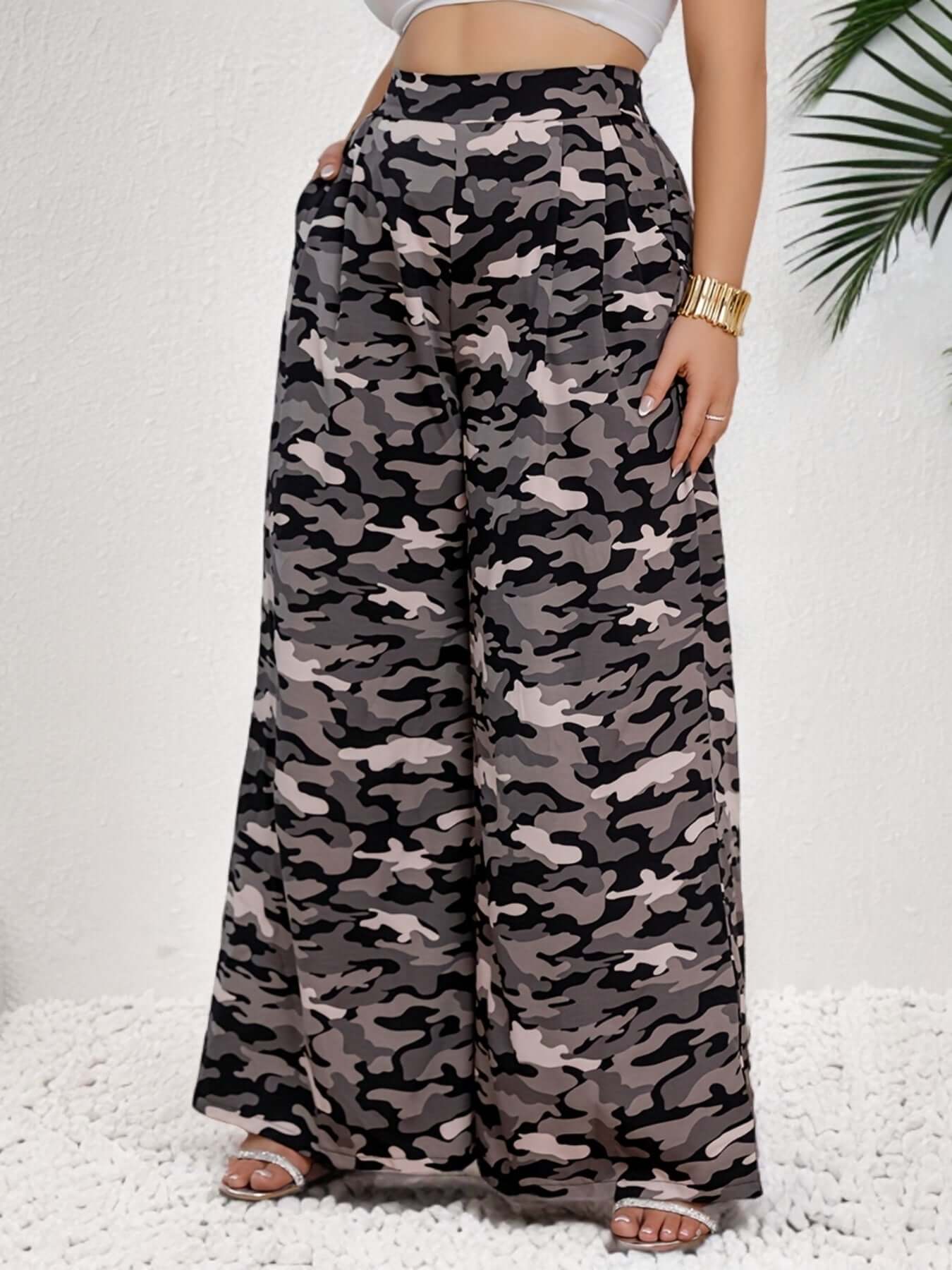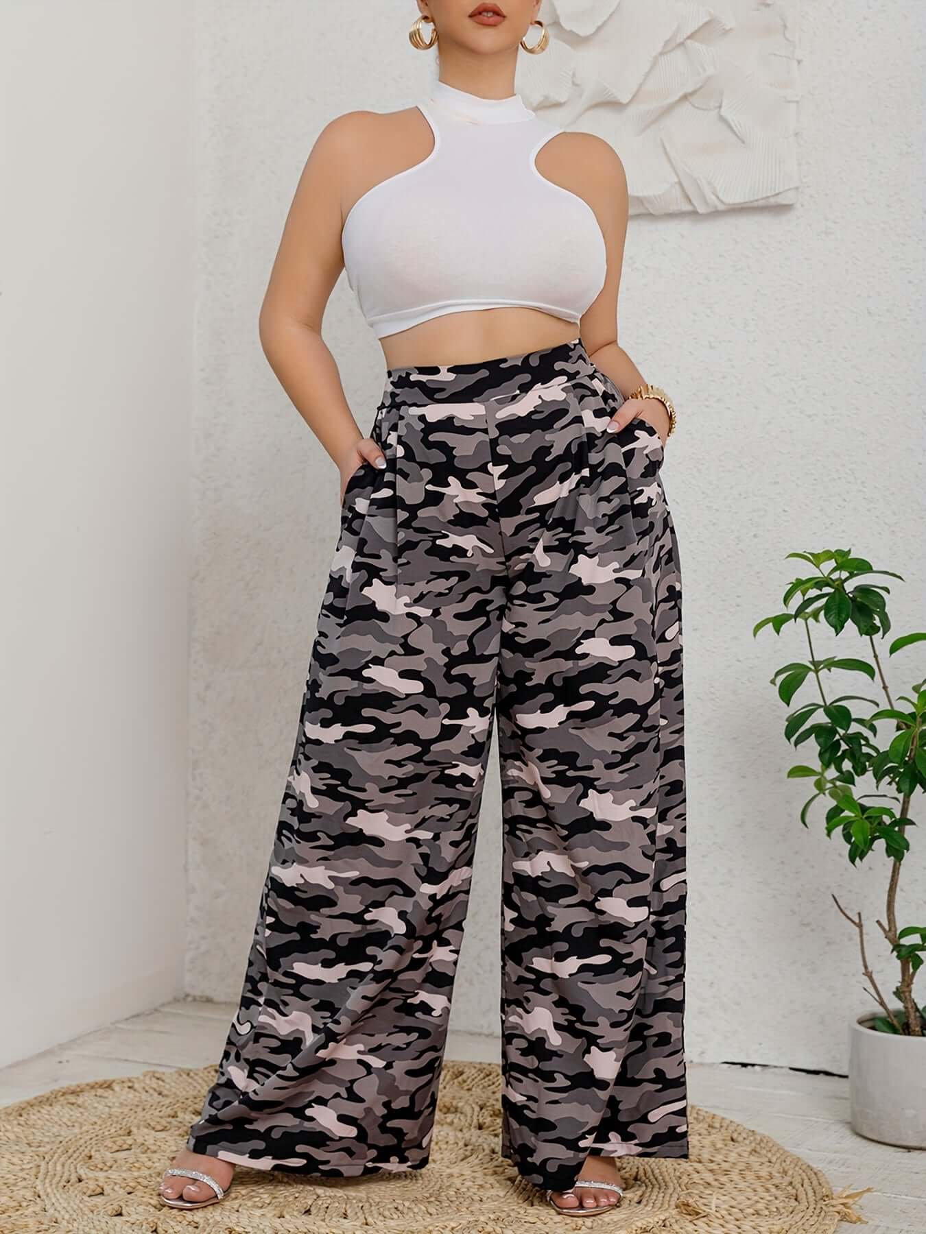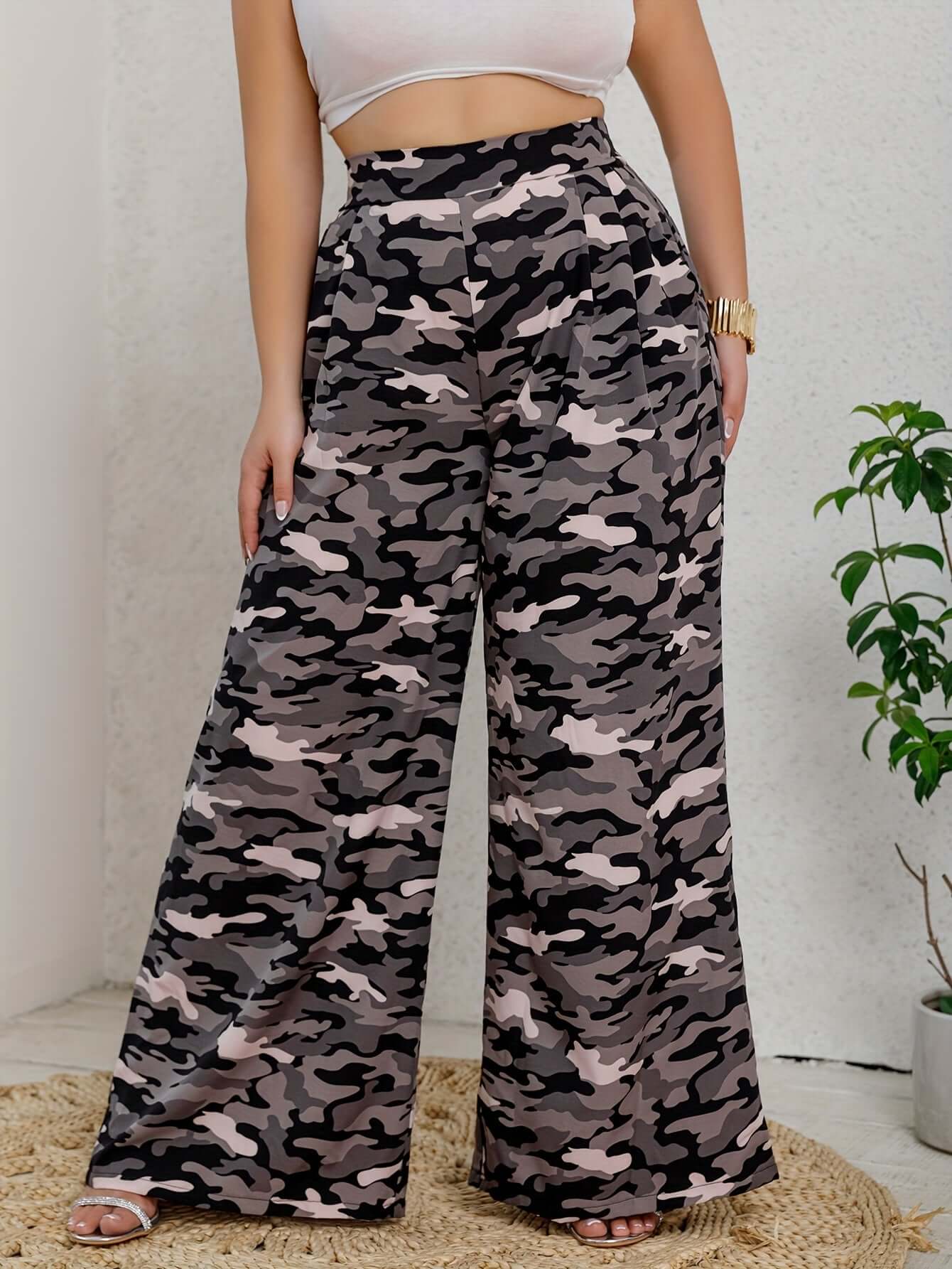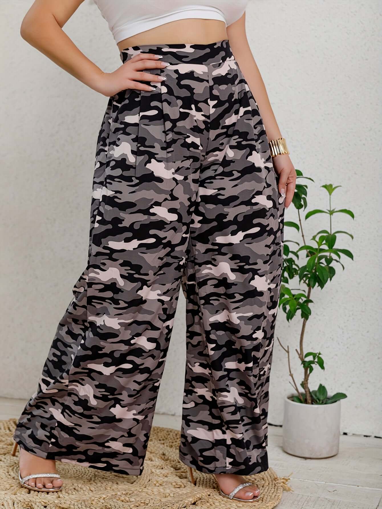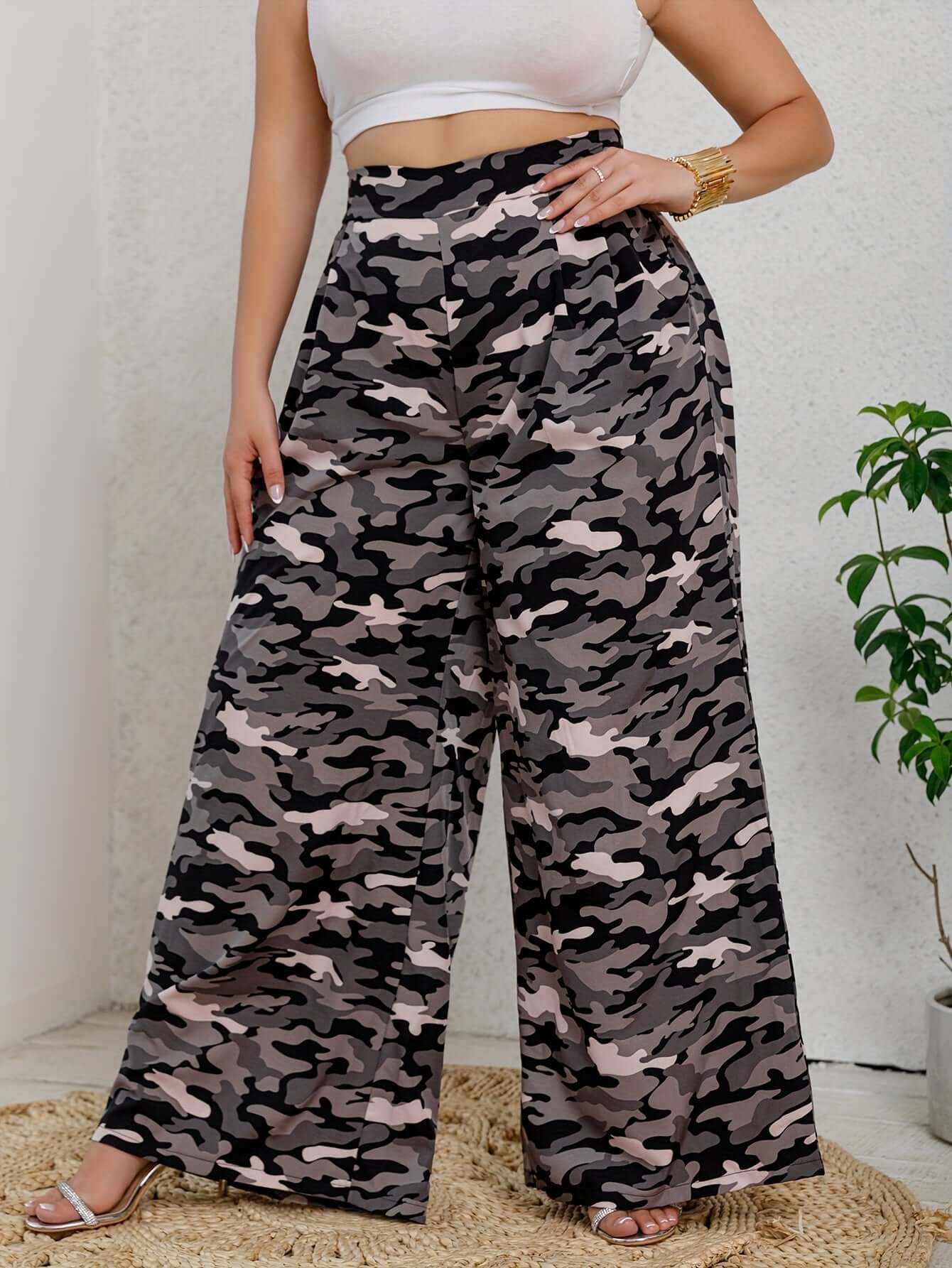 Gray Plus Size Camo Pants | Stylish High Waist Wide Leg