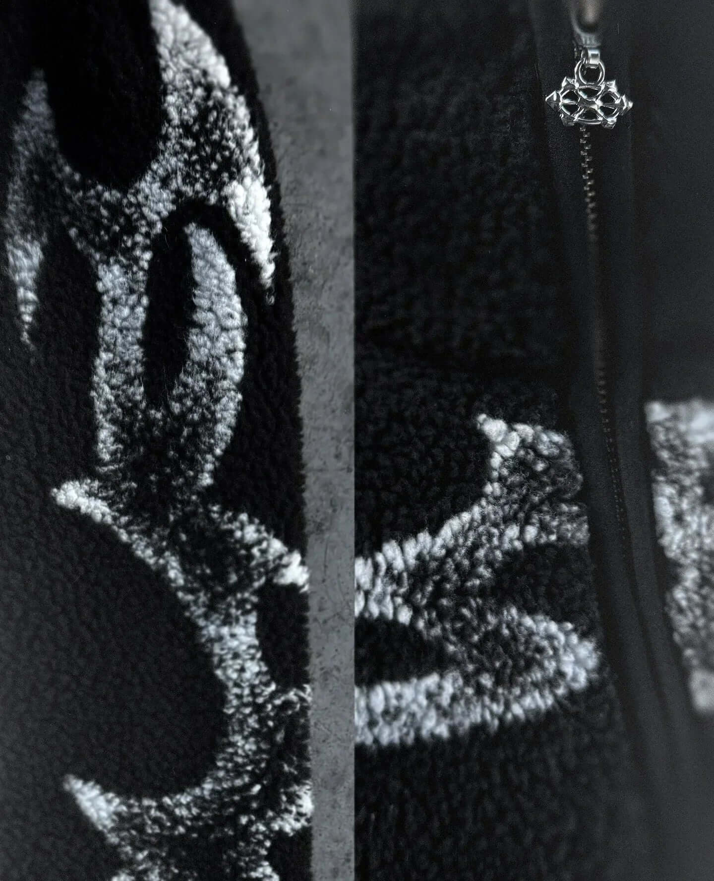 Crafted with a plush cotton lining and a touch of cashmere for softness, this jacket brings serious comfort without sacrificing edge. The upright stand collar adds structure and warmth, while the graphic print and applique details serve pure retro attitude. Ribbed cuffs lock in heat and complete the silhouette with a snug fit, while the full front zipper makes it easy to layer up or down depending on the vibe.
