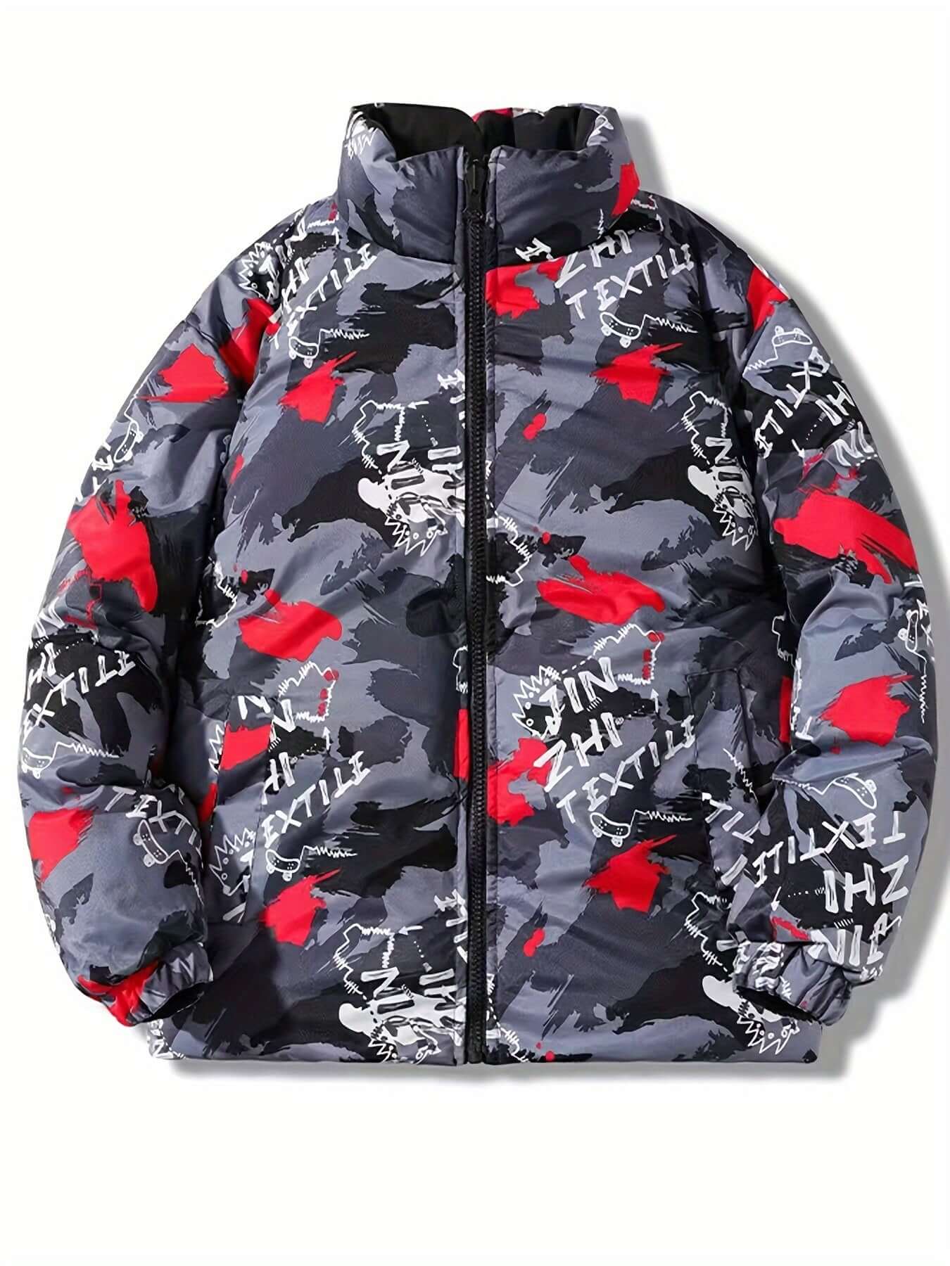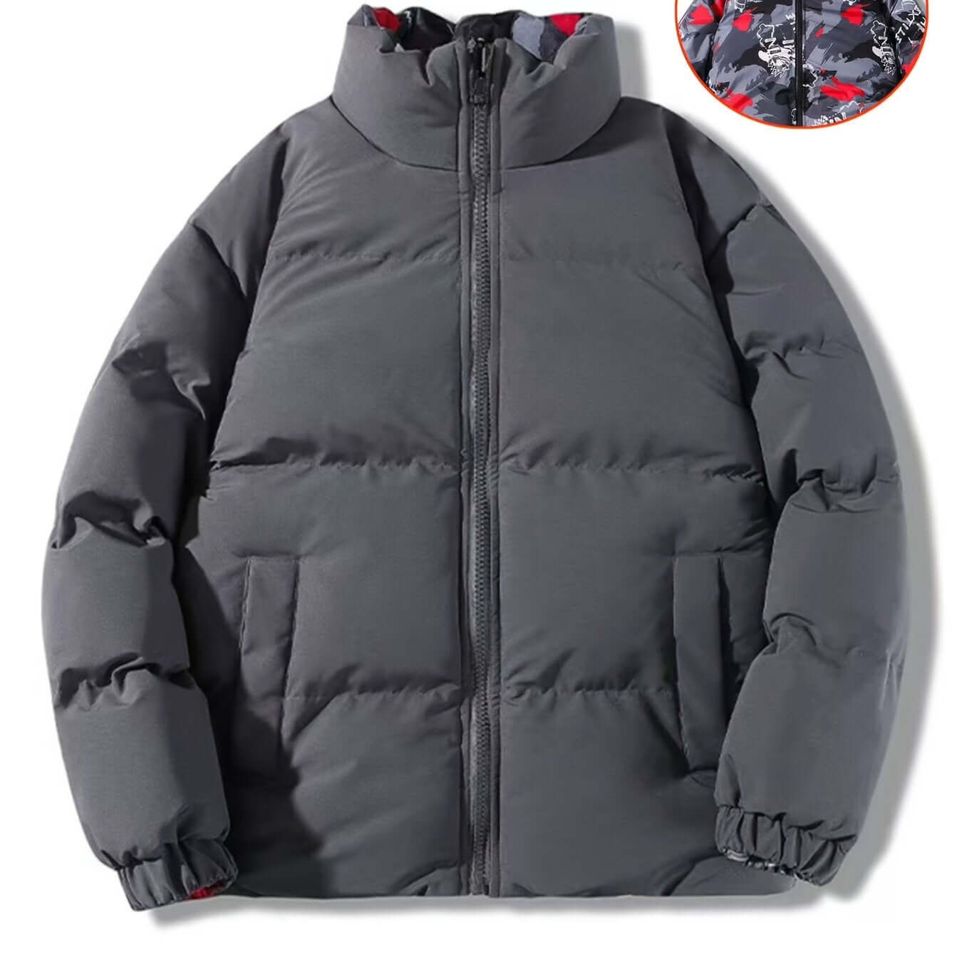 Reversible Camo Puffer Jacket for Men with Stand Collar and Zip Detail