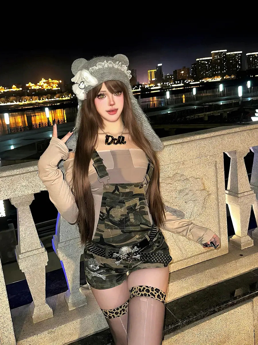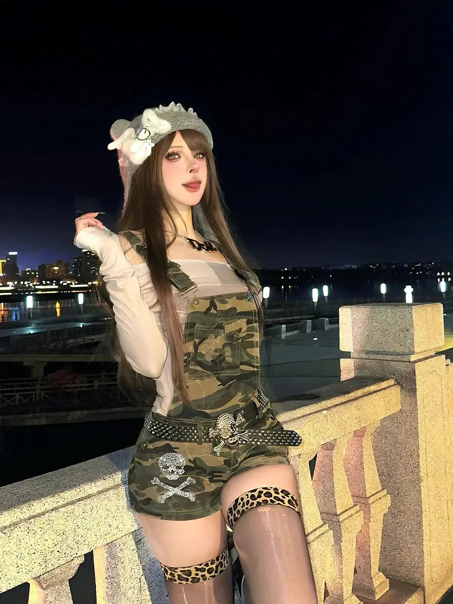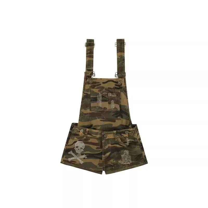 Level up your streetwear game with these Ripped Camo Overalls featuring Rhinestone Skull Detailing—an unapologetically bold look for trendsetters who don’t shy away from statement pieces. Designed with a low-rise waist and relaxed fit, this retro-inspired romper fuses Y2K rebellion with modern street style, perfect for spring and summer fashion moments.