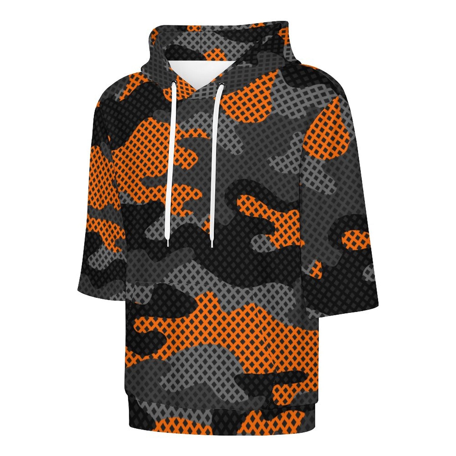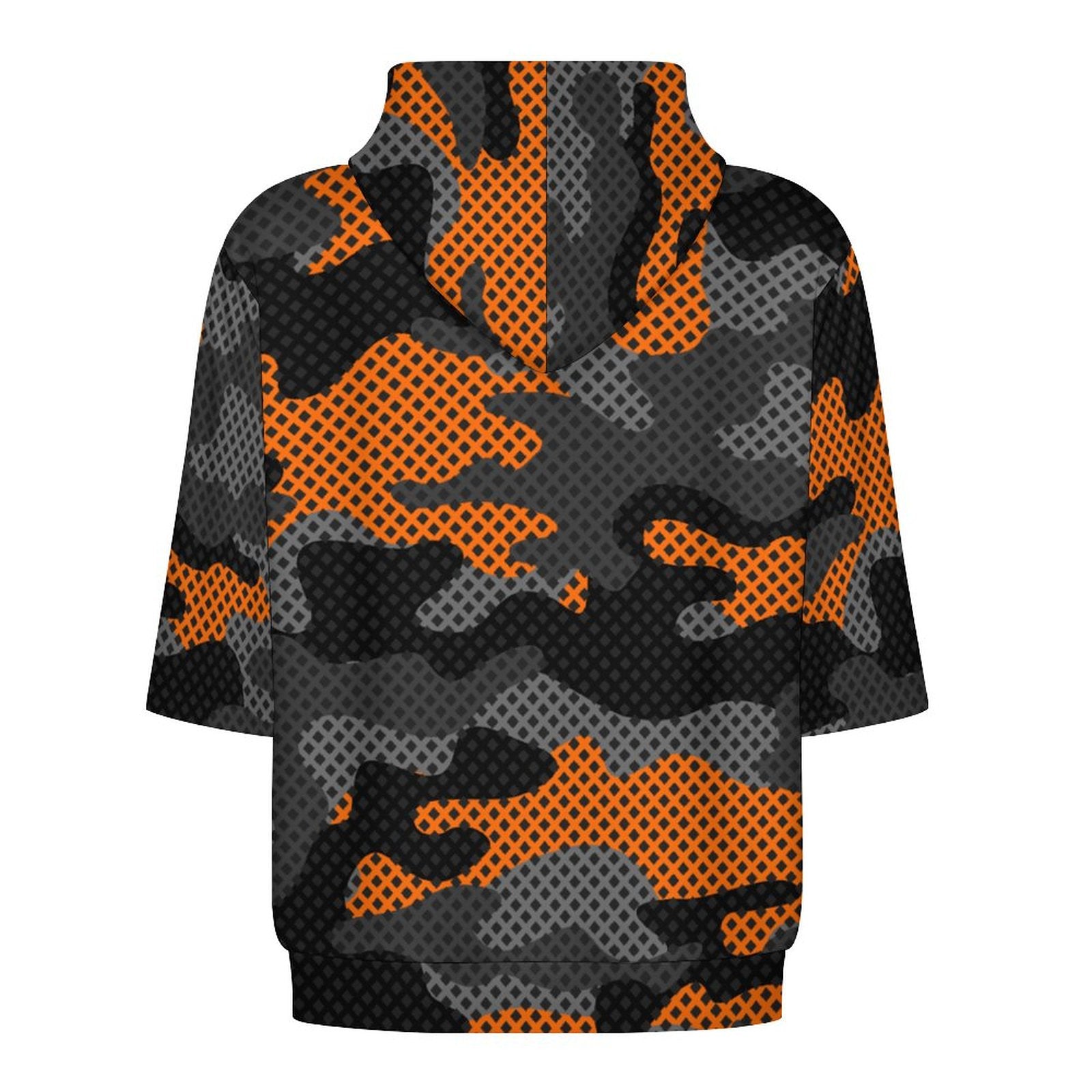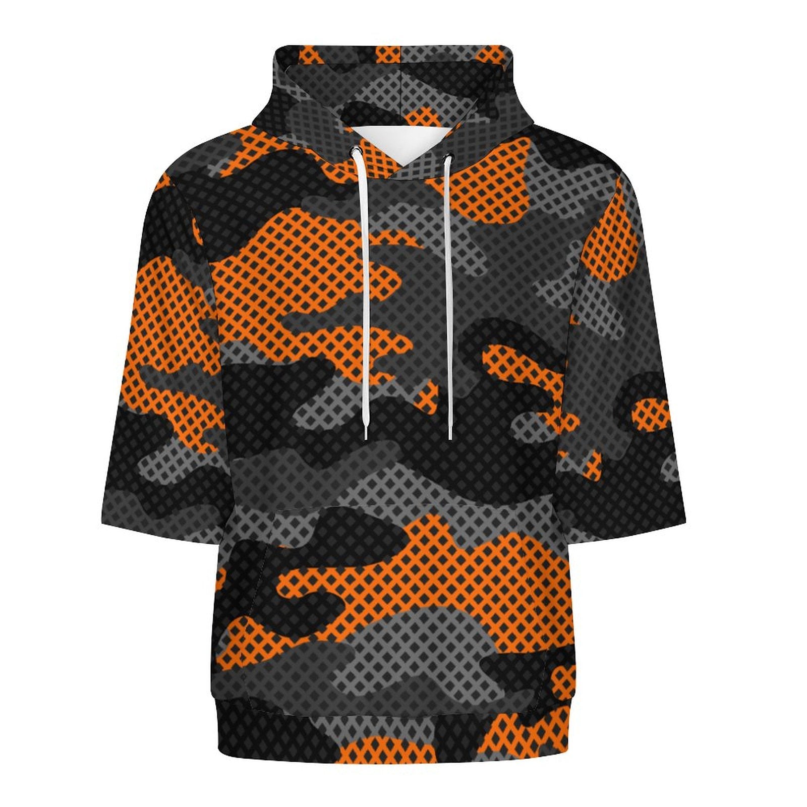 This Short Sleeve Hoodie features a unique Black & Orange Pixel Camouflage design. It combines the comfort of a hoodie with the coolness of short sleeves, making it a versatile and stylish addition to any wardrobe.