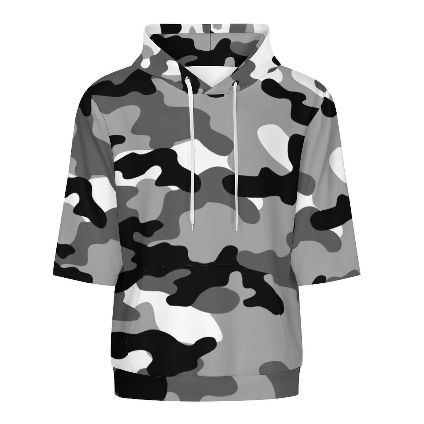 Stay stylish and comfortable with our Short Sleeve Hoodie in Black, White & Gray Camouflage. This versatile piece features a unique combination of colors and print, perfect for any casual or athletic occasion.