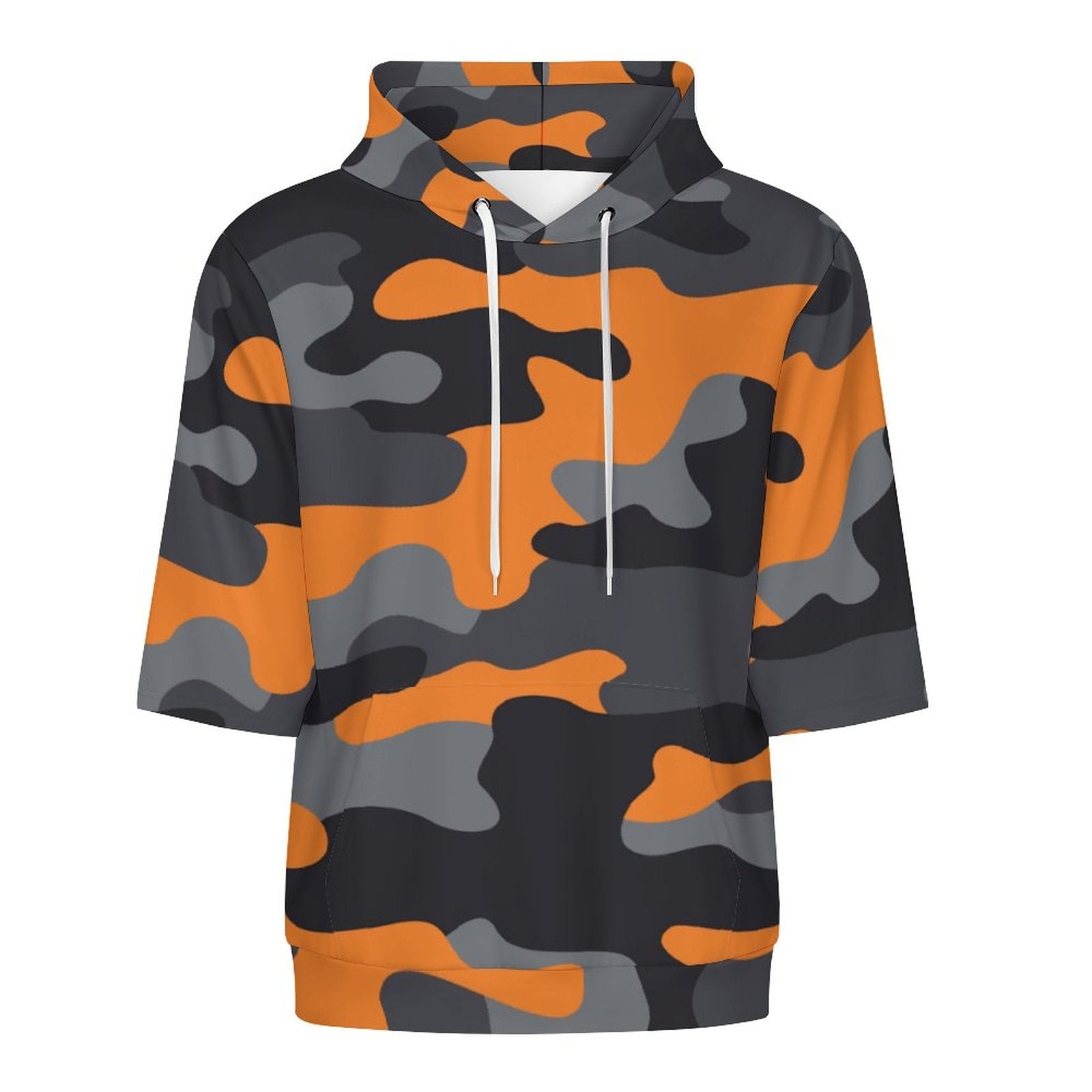 This versatile Short Sleeve Hoodie boasts a unique camouflage pattern, available in shades of orange, gray, and black. With a perfect blend of style and functionality, it is the perfect addition to your wardrobe.