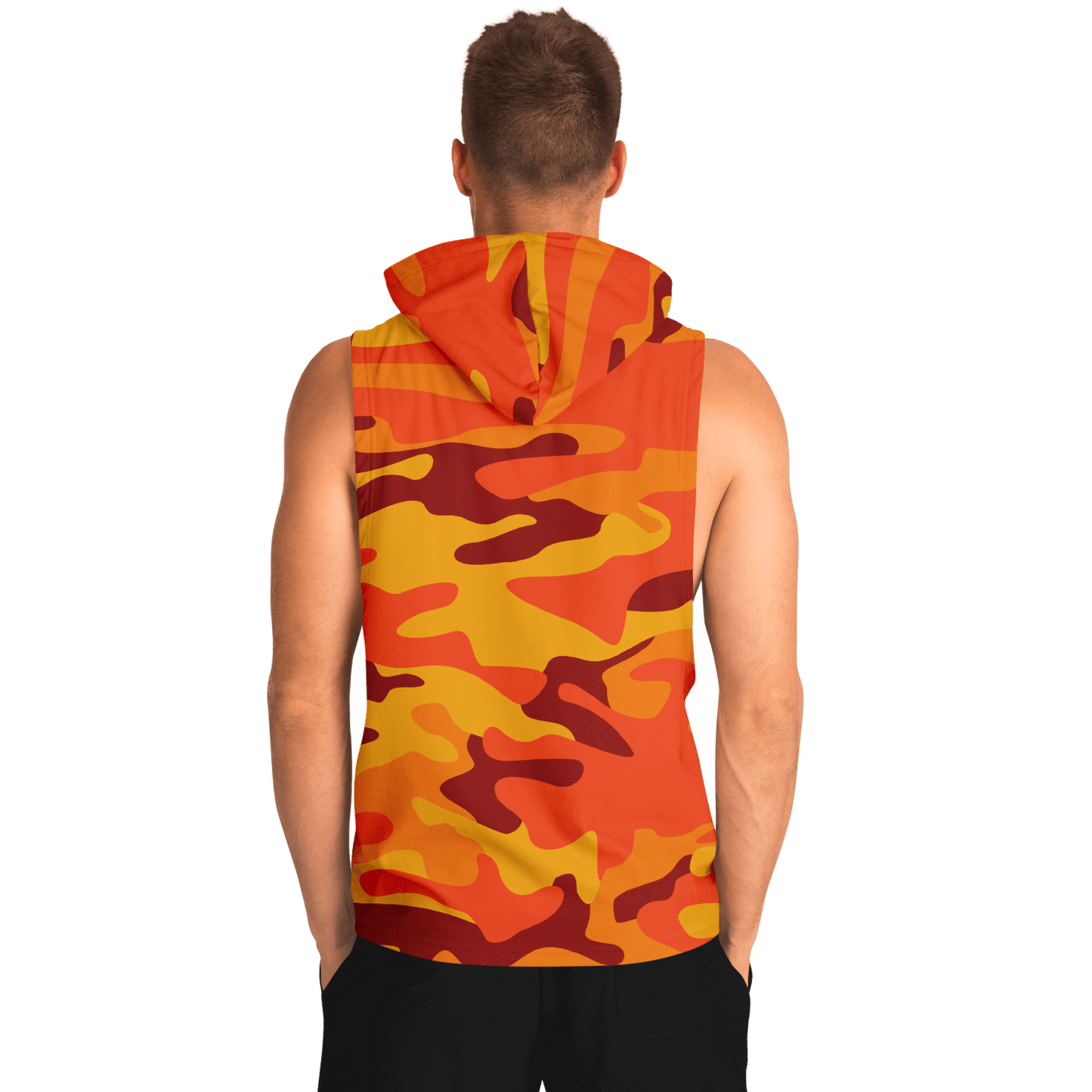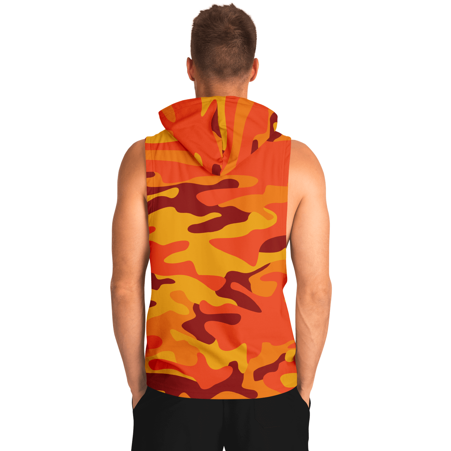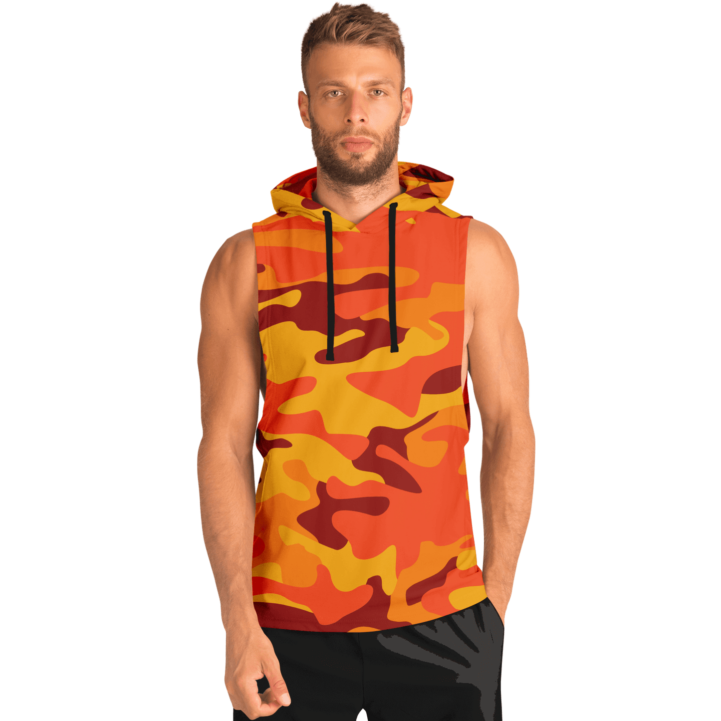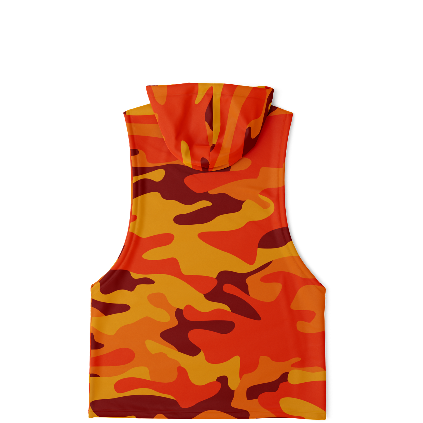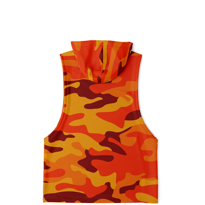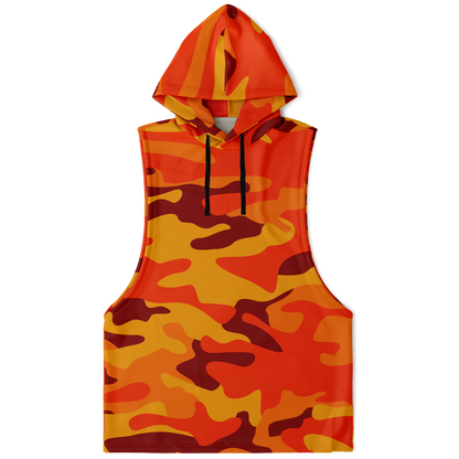 This sleeveless hoodie combines bold orange and red camouflage patterns for a unique and stylish look. Stay cool and comfortable while making a statement with this versatile and eye-catching hoodie. Perfect for any casual occasion.