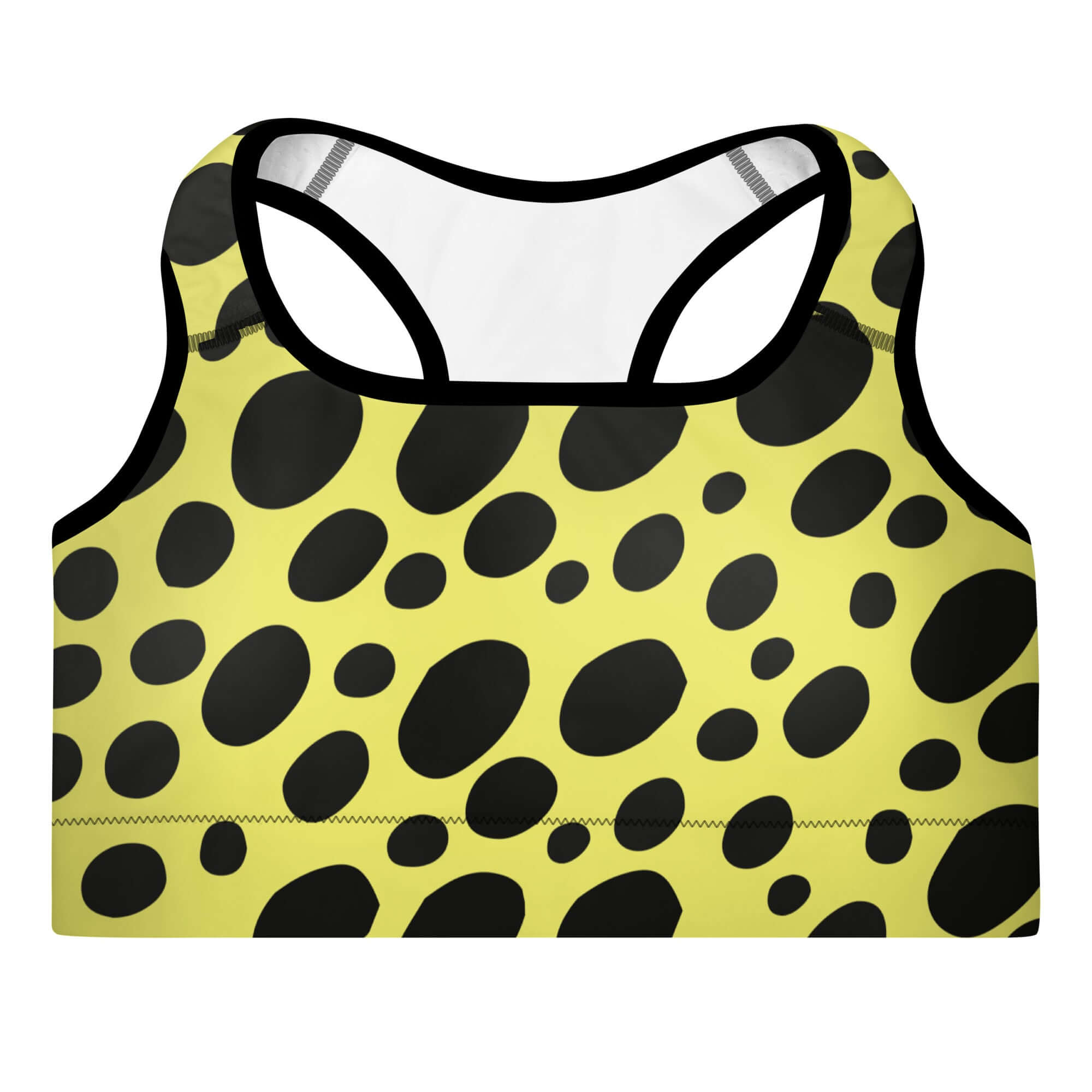 This sports bra for women features a stylish design with yellow and black spots, perfect for adding a pop of color to your workout outfit. With its supportive and comfortable fit, you can confidently tackle any physical activity, and feel confident and stylish doing so. Made with high-quality materials, this sports bra is designed for durability and functionality.