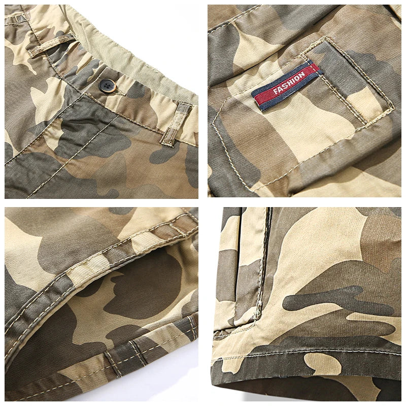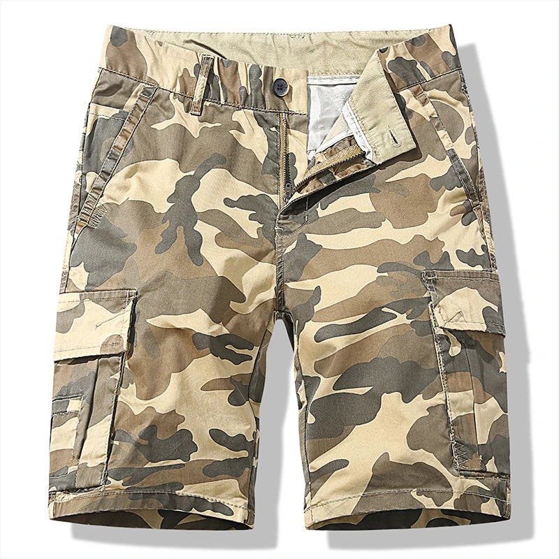 Expertly crafted, these Camouflage Cargo Shorts are perfect for summer. Made from a comfortable knit cotton, these shorts have a loose fit and feature a button fly closure. Designed for casual wear, they are versatile and suitable for a variety of scenes. Choose these stylish shorts for a cool and comfortable look.