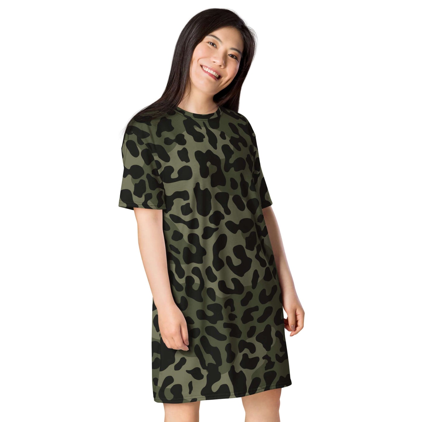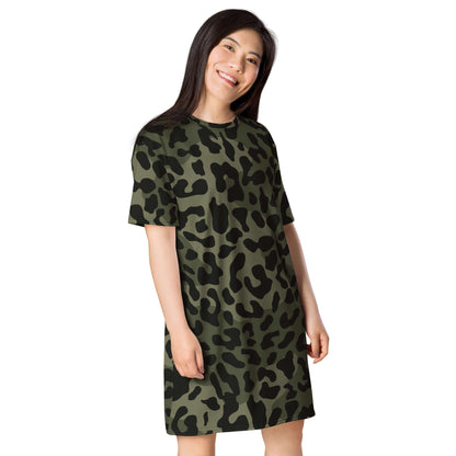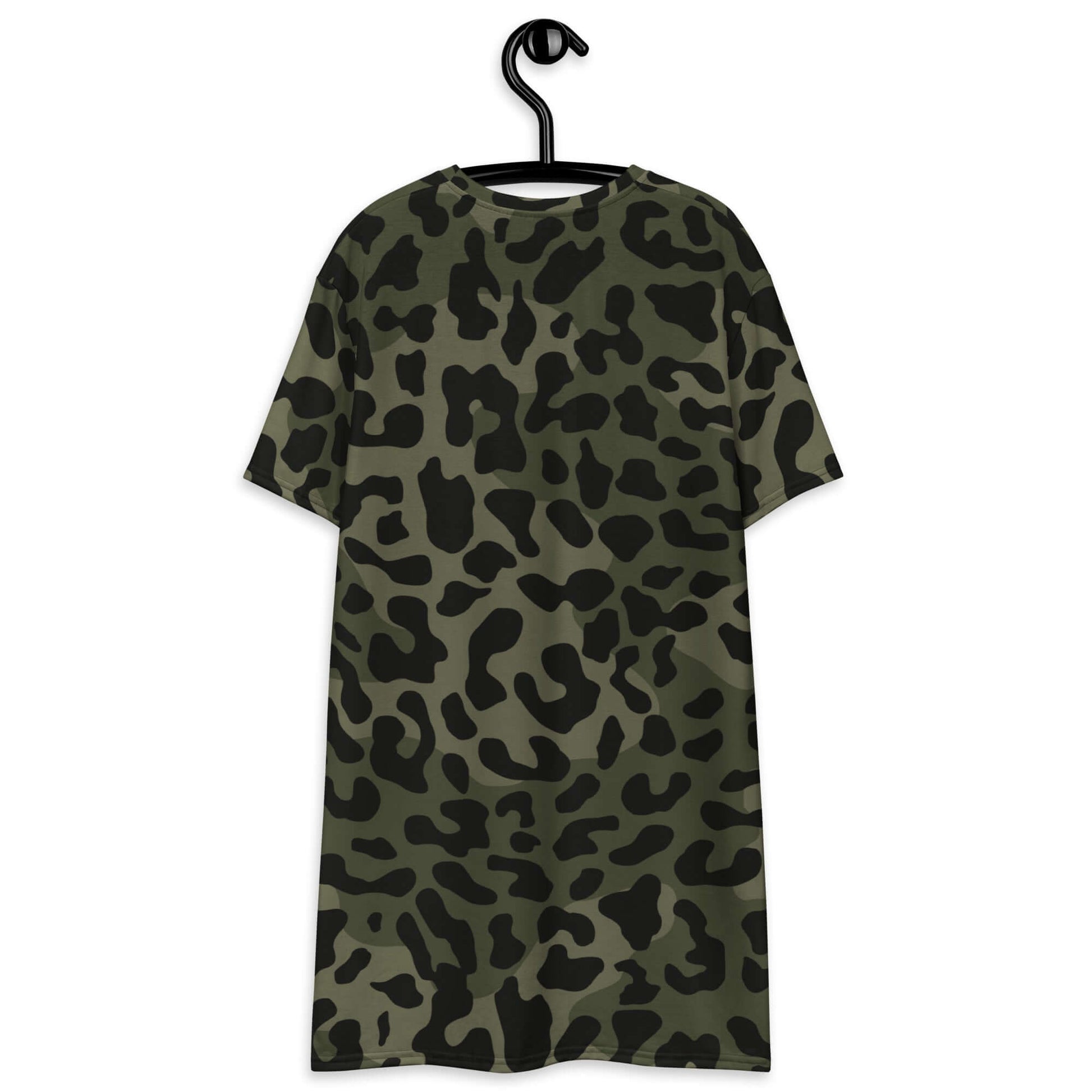 This T-shirt dress features a stylish brown leopard print design, perfect for adding a touch of wild to your wardrobe. Made from comfortable and lightweight fabric, it offers effortless style and easy wear. With its trendy print and versatile silhouette, this dress is a must-have for any fashion-forward individual.