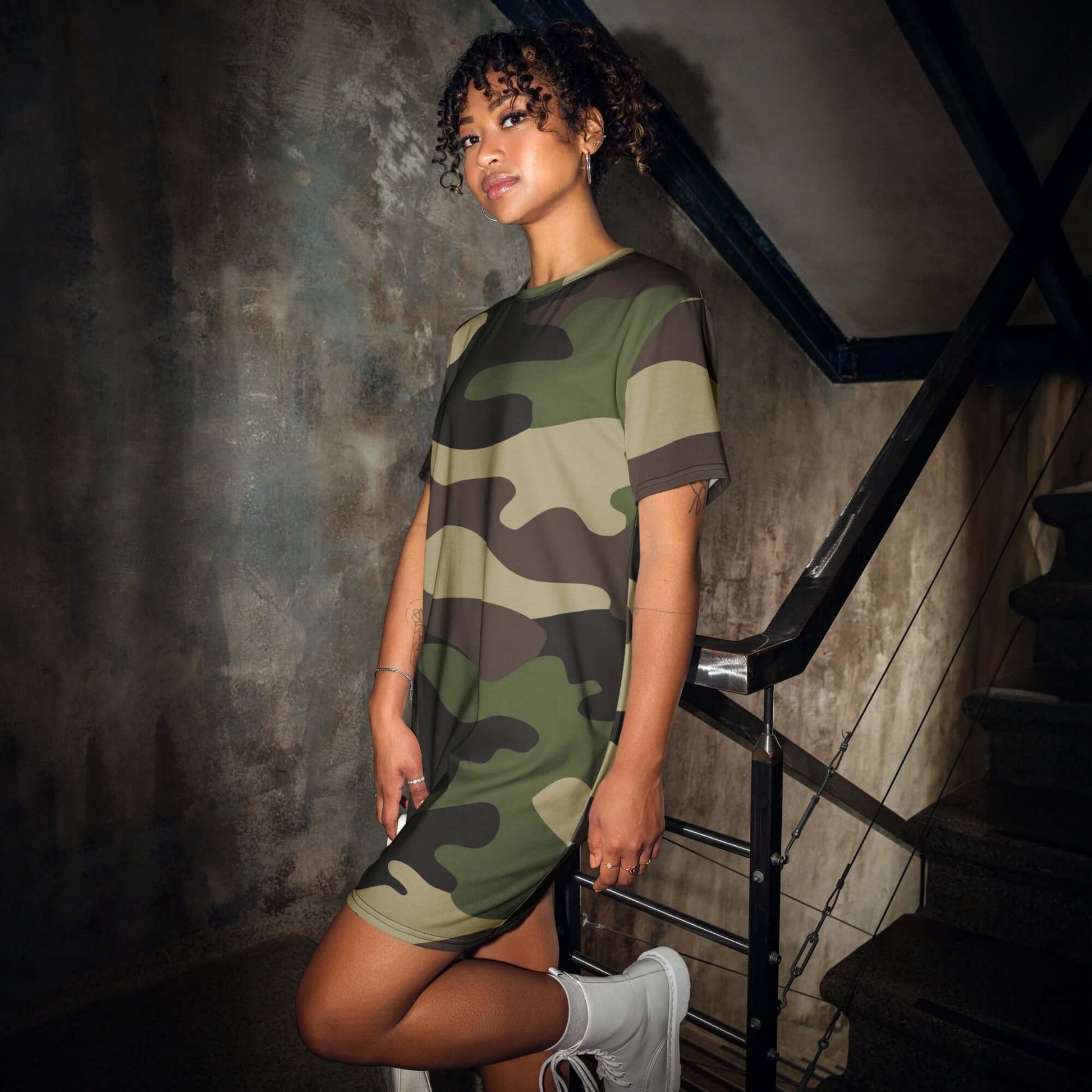 This T-shirt dress features a classic green camouflage print, perfect for adding a touch of edginess to your wardrobe. With its comfortable and versatile design, it can be dressed up or down for any occasion. Made with high-quality materials, it guarantees both style and comfort.