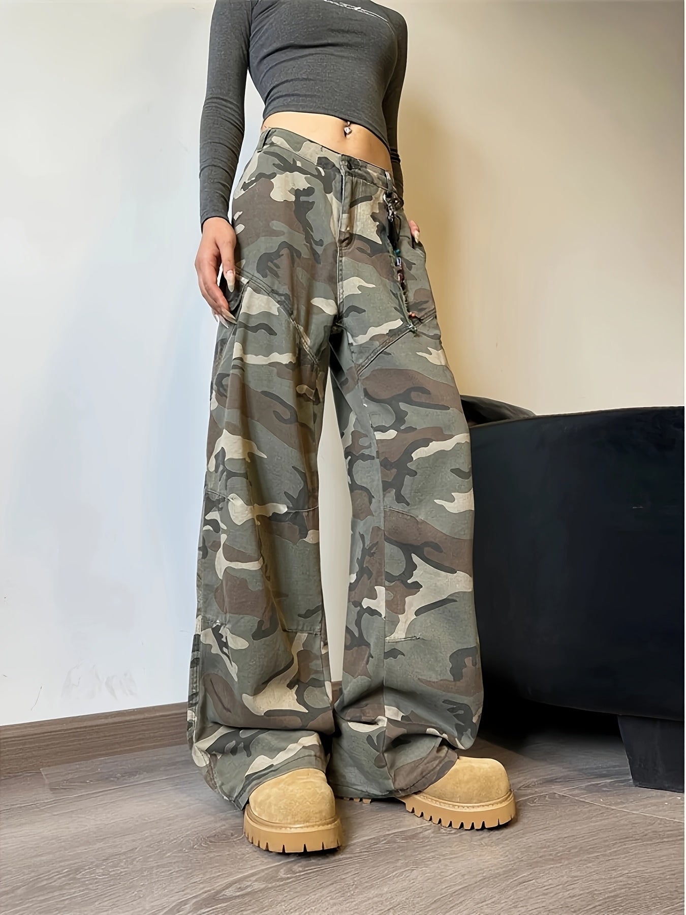 These Vintage-Inspired Camo Cargo Jeans are perfect for the fashion-forward woman. With their straight leg design and subtle camouflage pattern, these jeans will add a touch of edginess to any outfit. Made with high-quality materials and a vintage-inspired look, these jeans are perfect for everyday wear or special occasions. Stay on-trend and comfortable with these must-have cargo jeans.