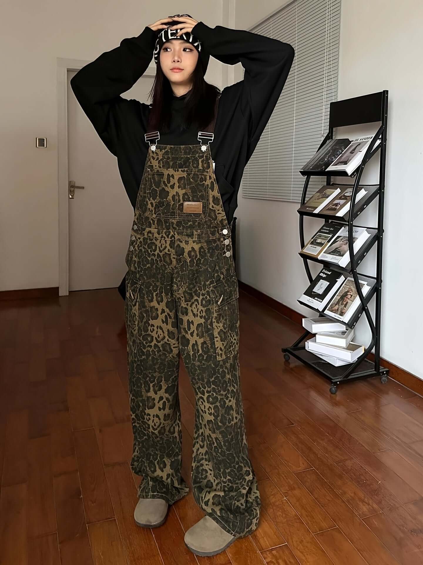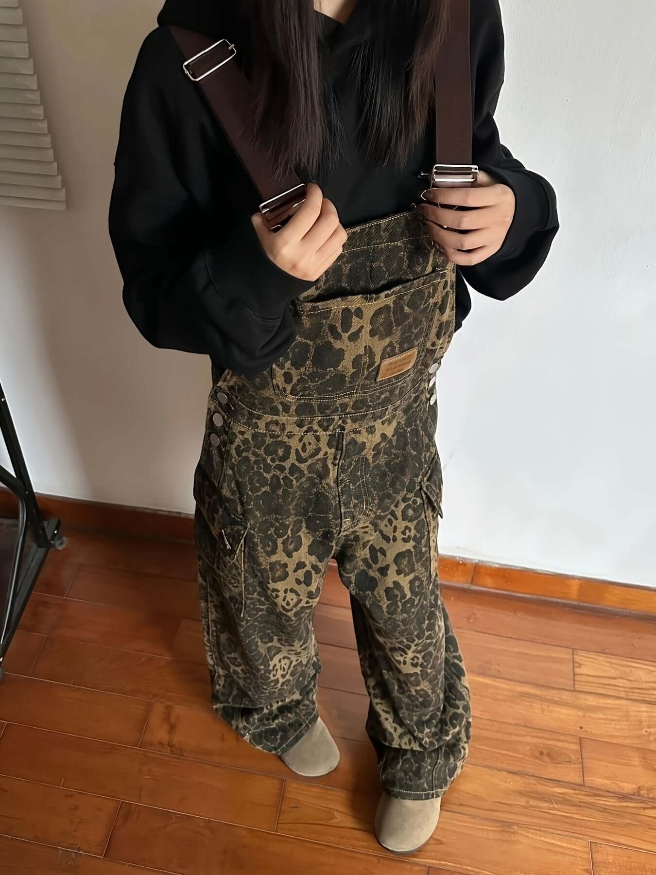 Vintage Leopard Print Denim Overalls for Women | Wide Leg, Loose Fit