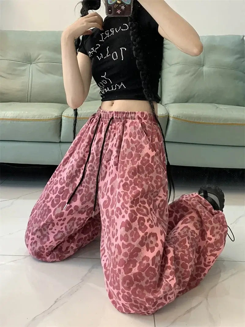 Styling Tips: Pair these bold joggers with a fitted crop top or oversized hoodie to balance the loose fit. For a complete Y2K-inspired look, throw on some chunky sneakers and accessorize with a statement chain or a crossbody bag. These jogger sweatpants are perfect for creating an effortlessly cool outfit, whether you’re heading to the gym or meeting up with friends. Embrace the retro vibe by layering them with a denim jacket or leather bomber for added edge. The vibrant leopard print ensures you’ll stand out no matter where you go.