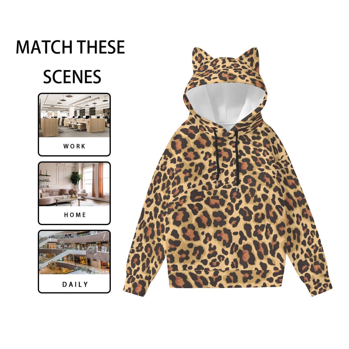 This women's leopard hoodie with cat's ears in brown and black is a stylish and playful addition to any wardrobe. Made with soft and comfortable material, it offers both warmth and fashion. Perfect for adding a touch of fun to your everyday outfit.