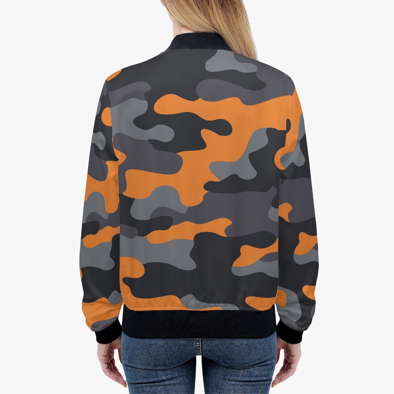 Women's Camo Bomber Jacket | Orange, Black, and Gray Camouflage