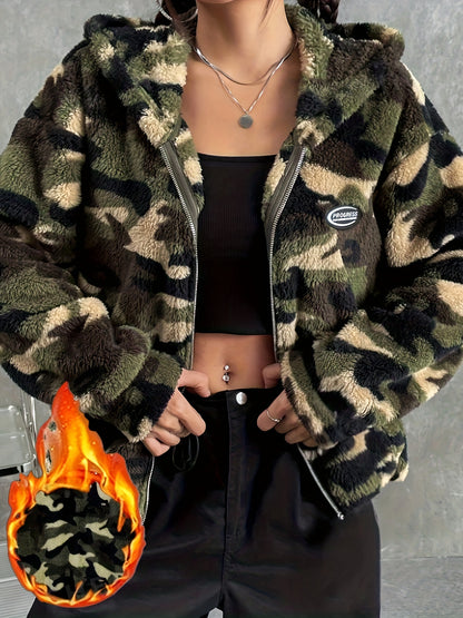 Stay cozy and stylish with our Women's Camo Print Zip-up Fluffy Jacket. Perfect for fall and winter, this hooded jacket combines warmth and fashion with its soft, fluffy texture and trendy camouflage design. The zip-up front makes it easy to layer, while the spacious hood provides extra comfort and protection against chilly weather. Designed for both functionality and flair, this jacket is ideal for casual outings, outdoor adventures, or relaxing at home. Its relaxed fit ensures all-day comfort without compromising on style. Add a touch of rugged elegance to your cold-weather wardrobe with this must-have camo jacket!