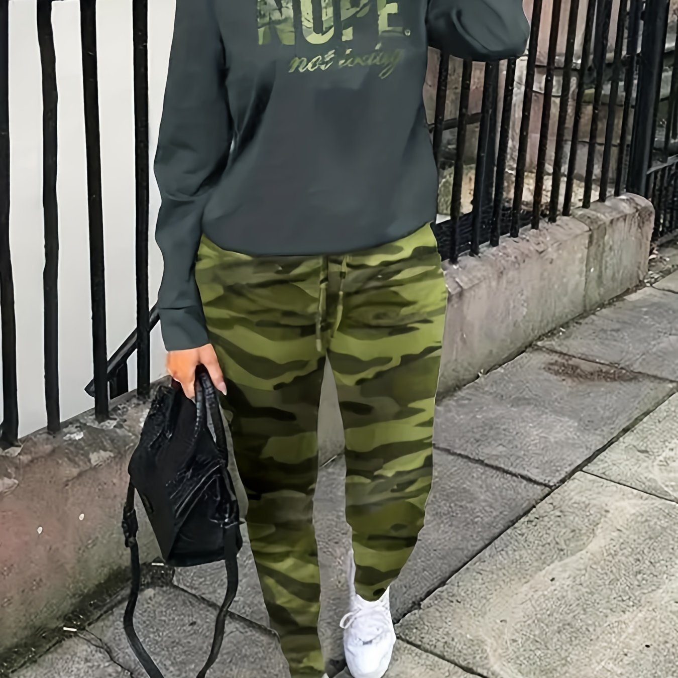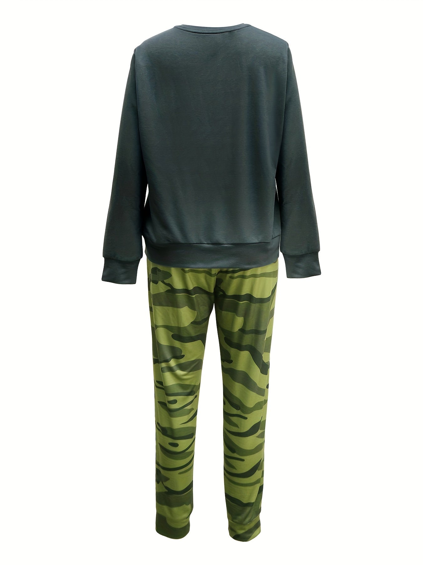 Women's Letter & Camo Print Set: Crew Neck Top & Shorts