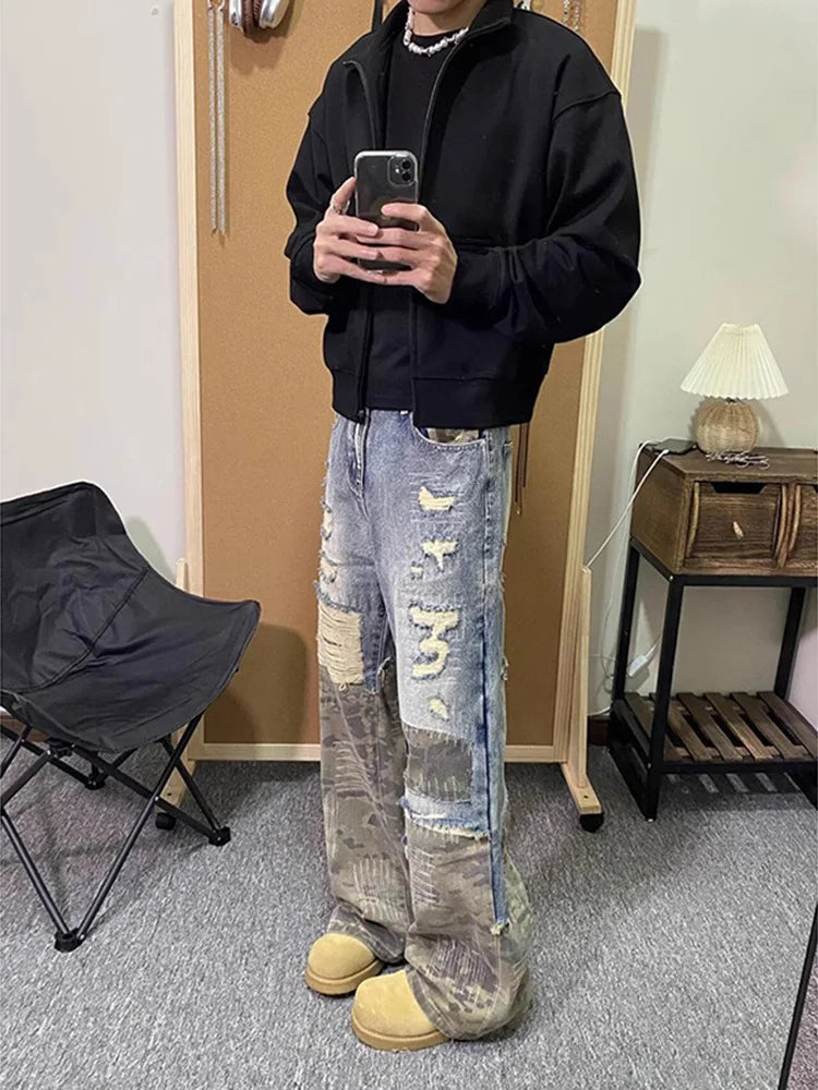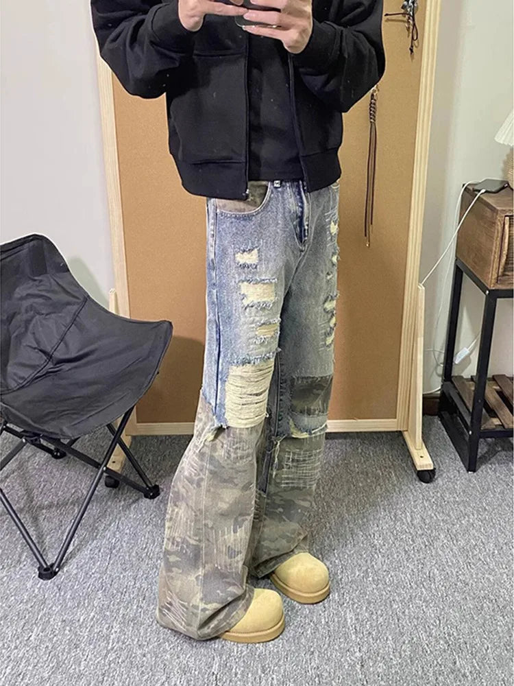 Y2K Camo Patchwork Hip-Hop Straight-Leg Jeans