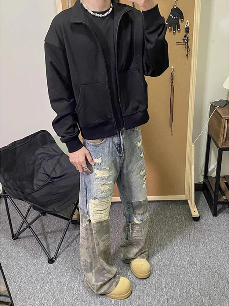 Bring vintage flair to your wardrobe with these Y2K Camo Patchwork Straight-Leg Jeans, inspired by classic American hip-hop fashion. These statement-making designer pants are perfect for men who want to combine casual comfort with bold streetwear style. Crafted from durable denim, these jeans feature a striking camouflage patchwork design that sets them apart from ordinary pants.
