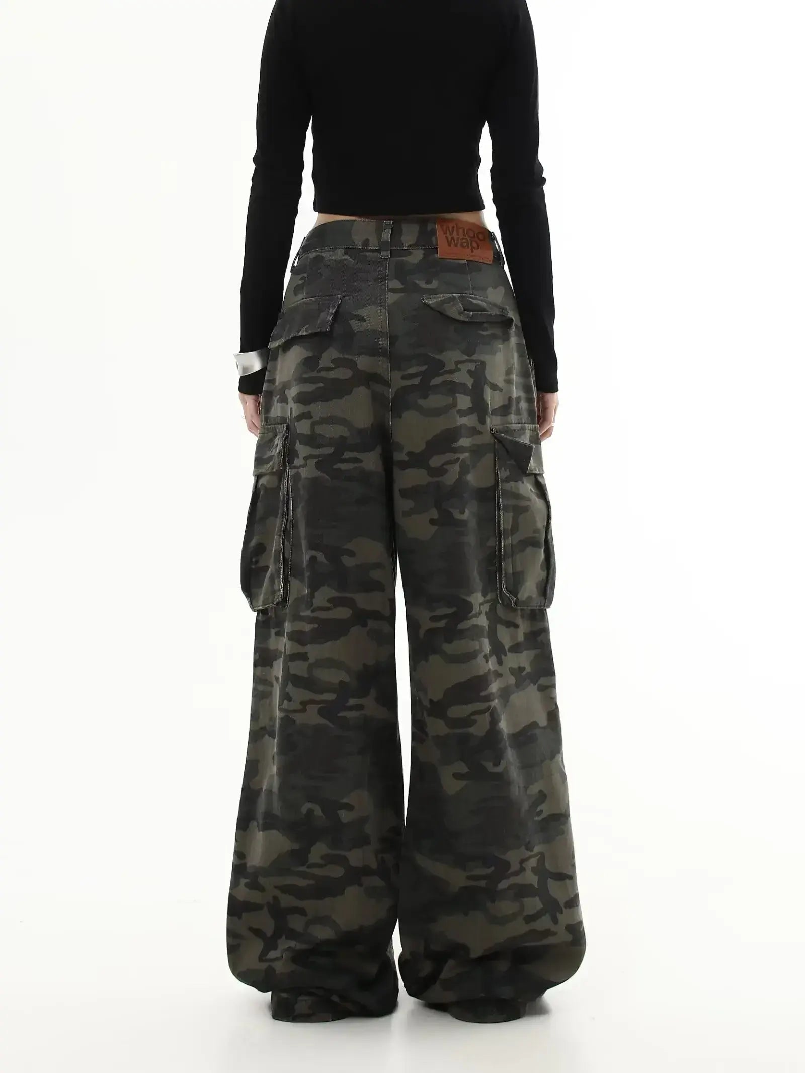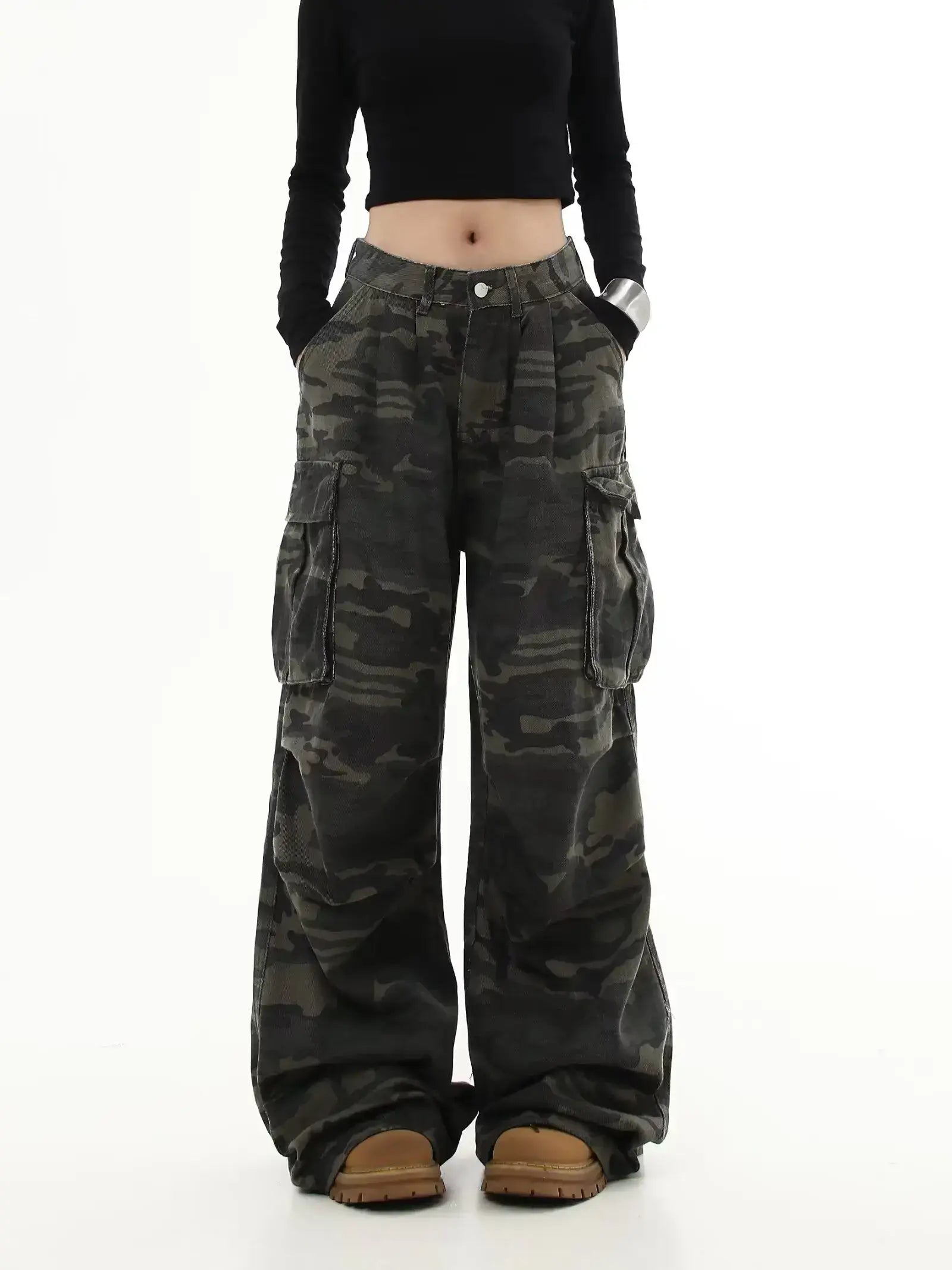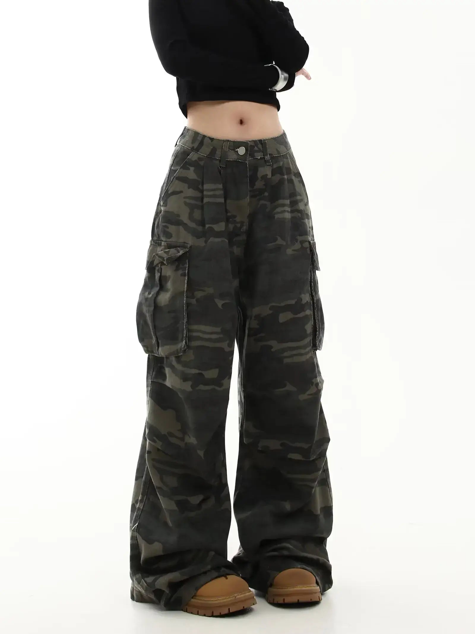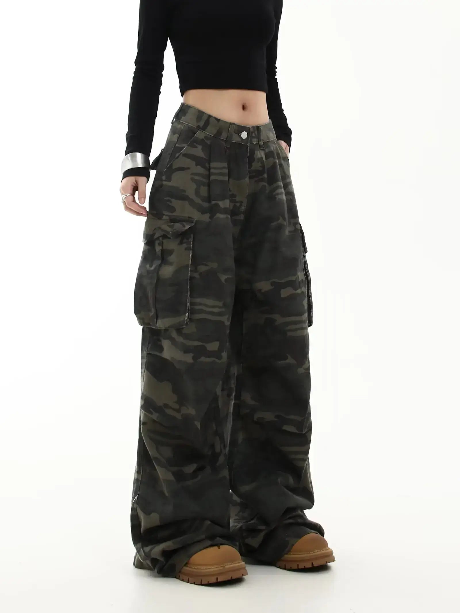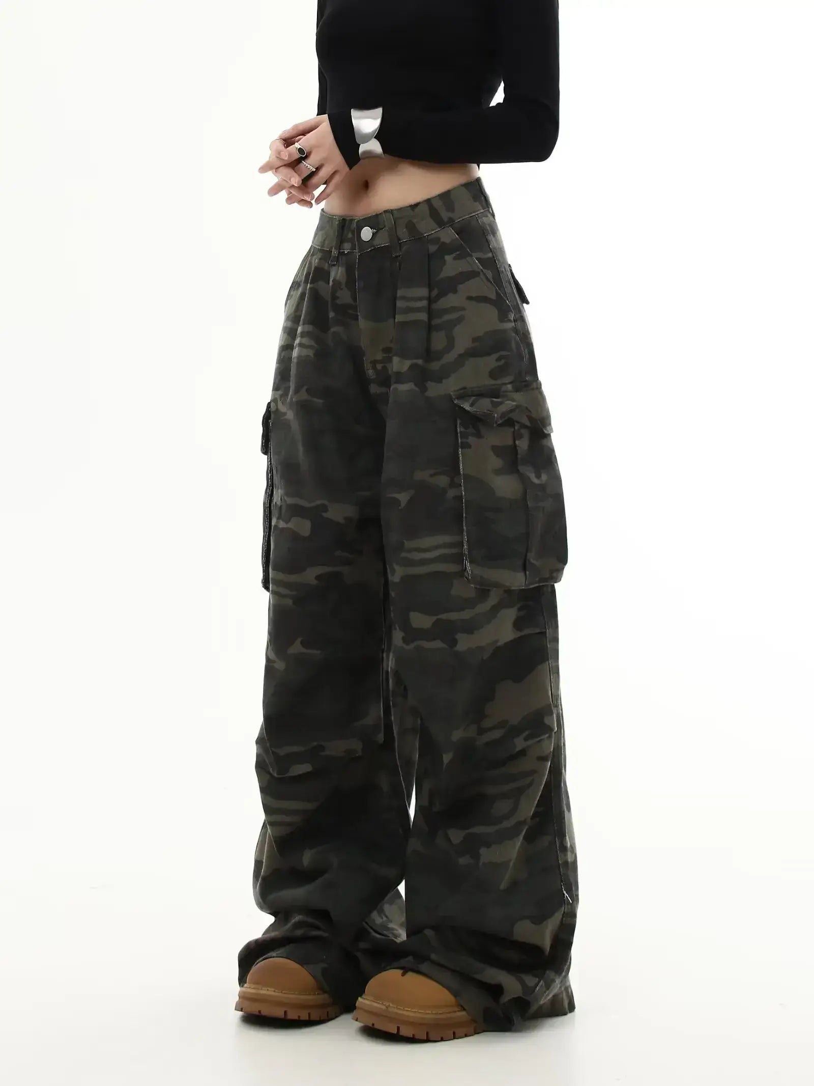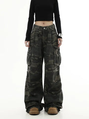 Step into the spotlight with our Y2K Low-Rise Camo Cargo Pants, a bold blend of retro streetwear and Harajuku-inspired attitude. Designed to channel the spirit of early 2000s fashion, these wide-leg trousers feature edgy lace-up details and a tie-dye camo wash that brings an eye-catching twist to everyday casual wear.
