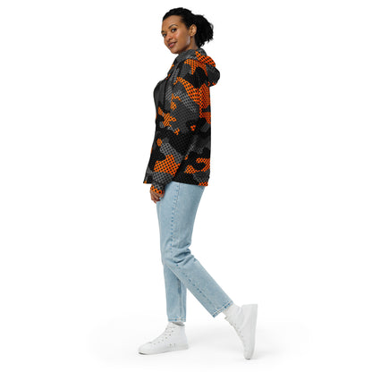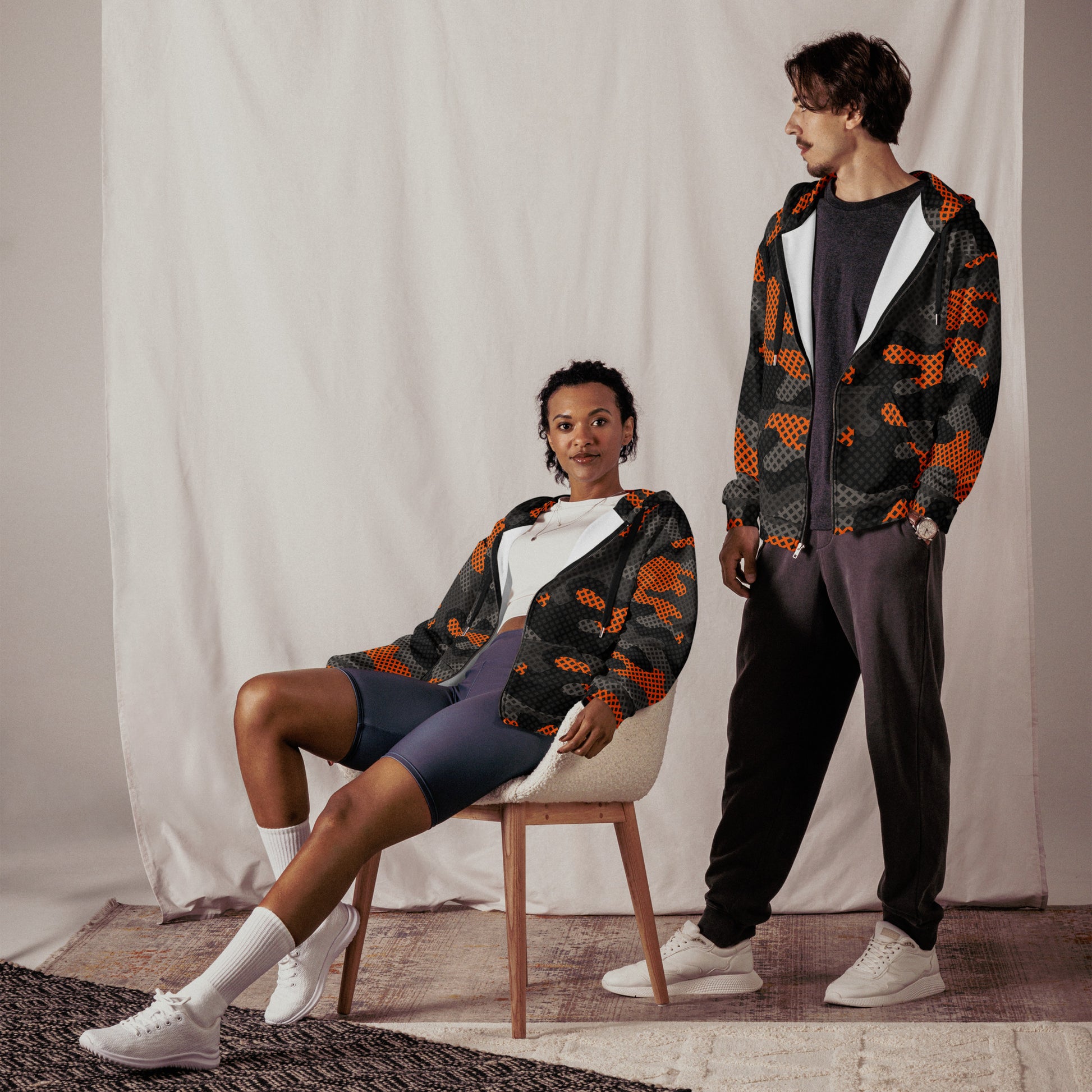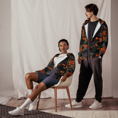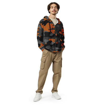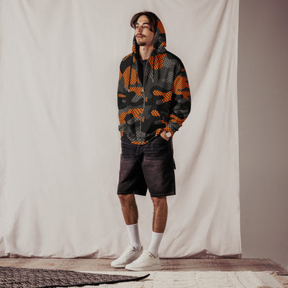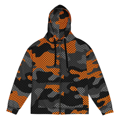 Camo Zip Hoodie – Black & Orange Pixel Look