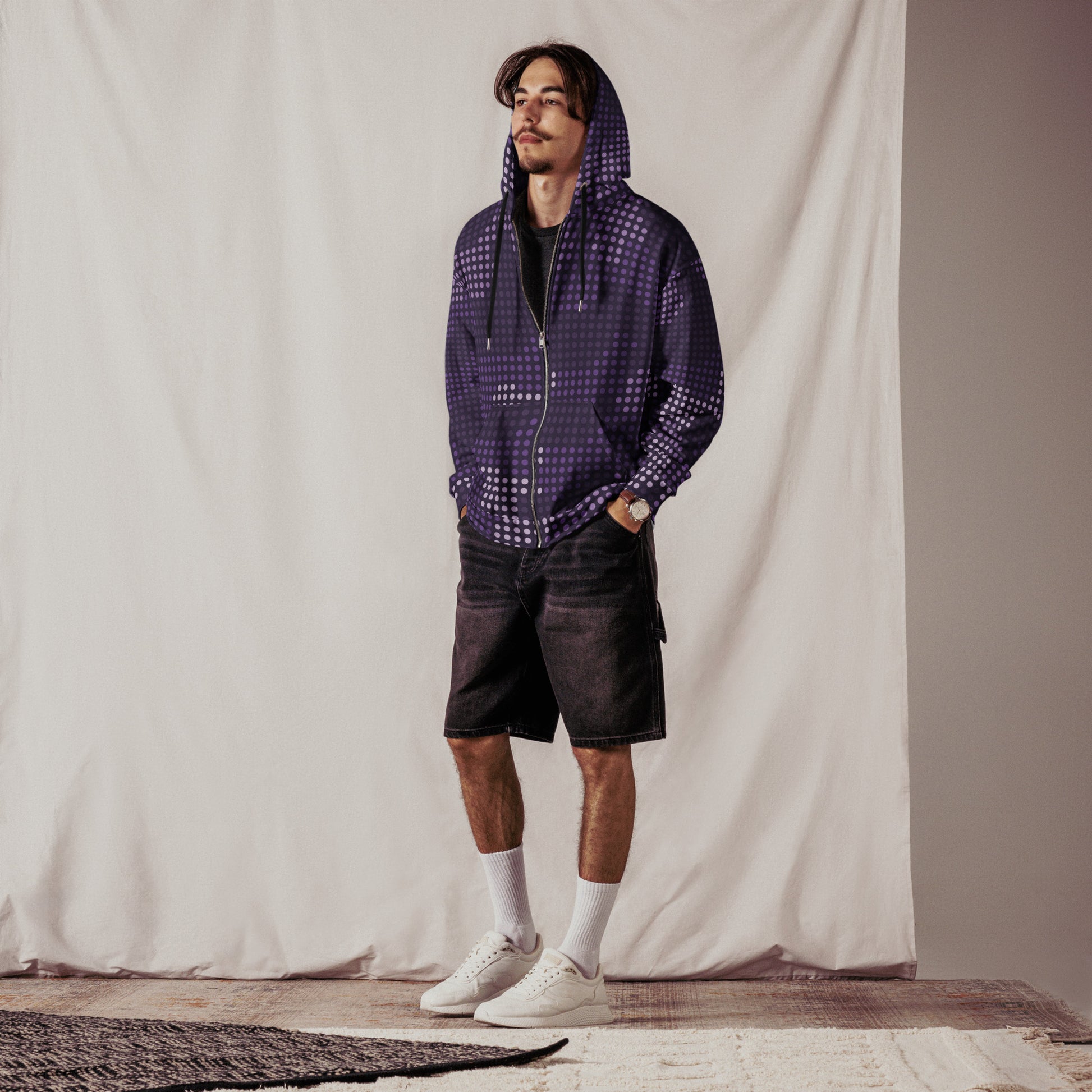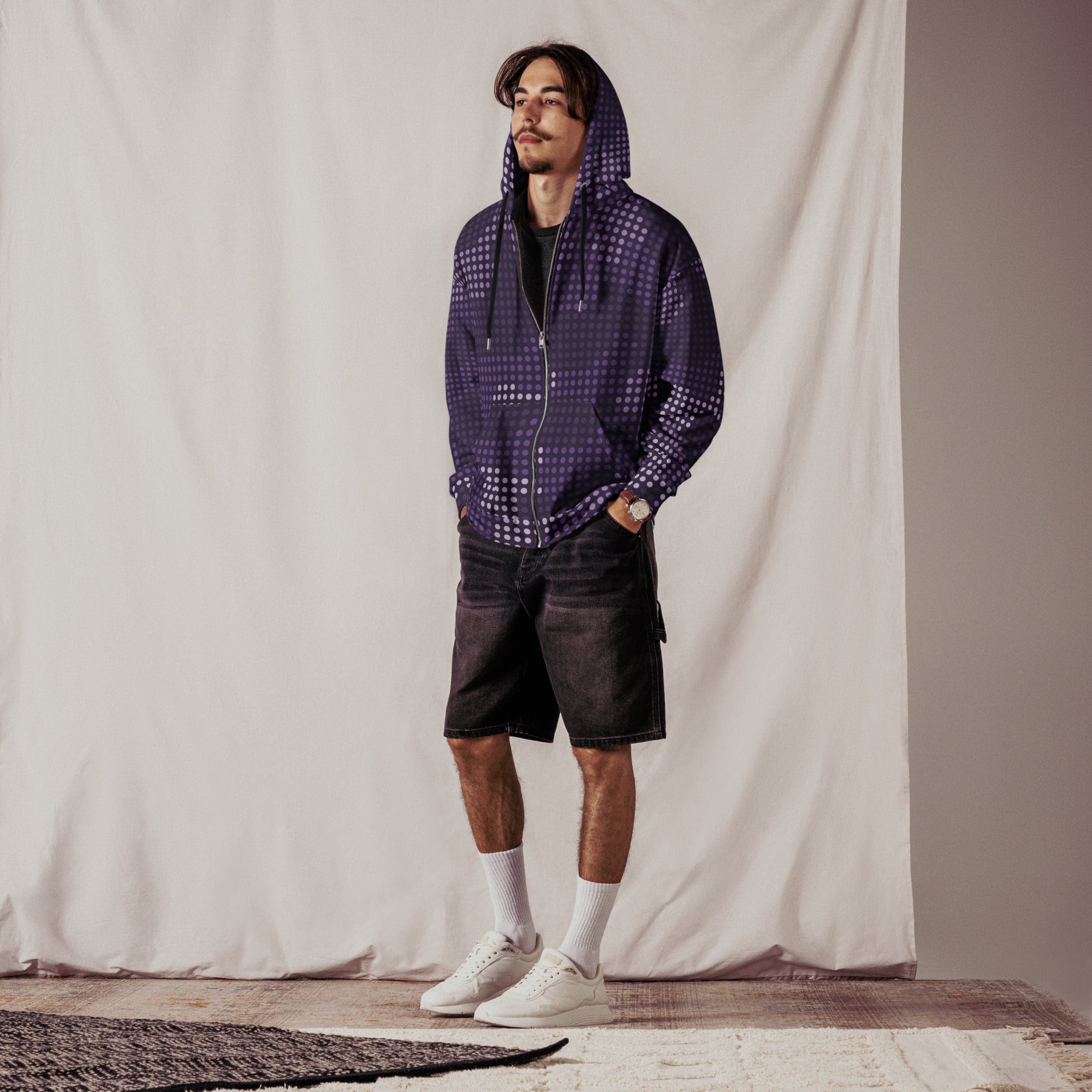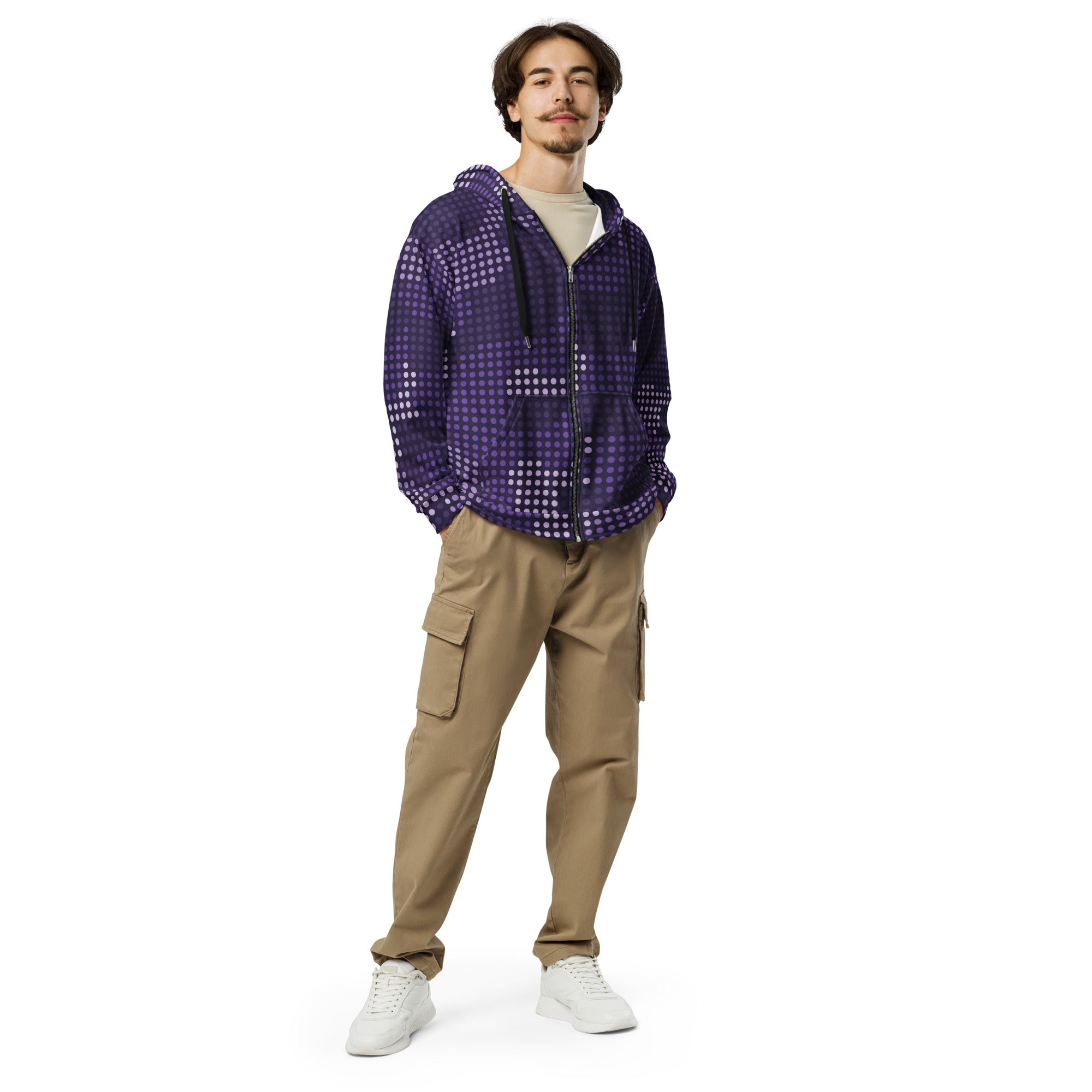 Stay camouflaged in style with our Camo Zip Hoodie in Electric Blue LED Camo. Made with high-quality materials, this hoodie features a unique camouflage design and built-in LED lights that light up your look. Perfect for outdoor adventures and night time activities.